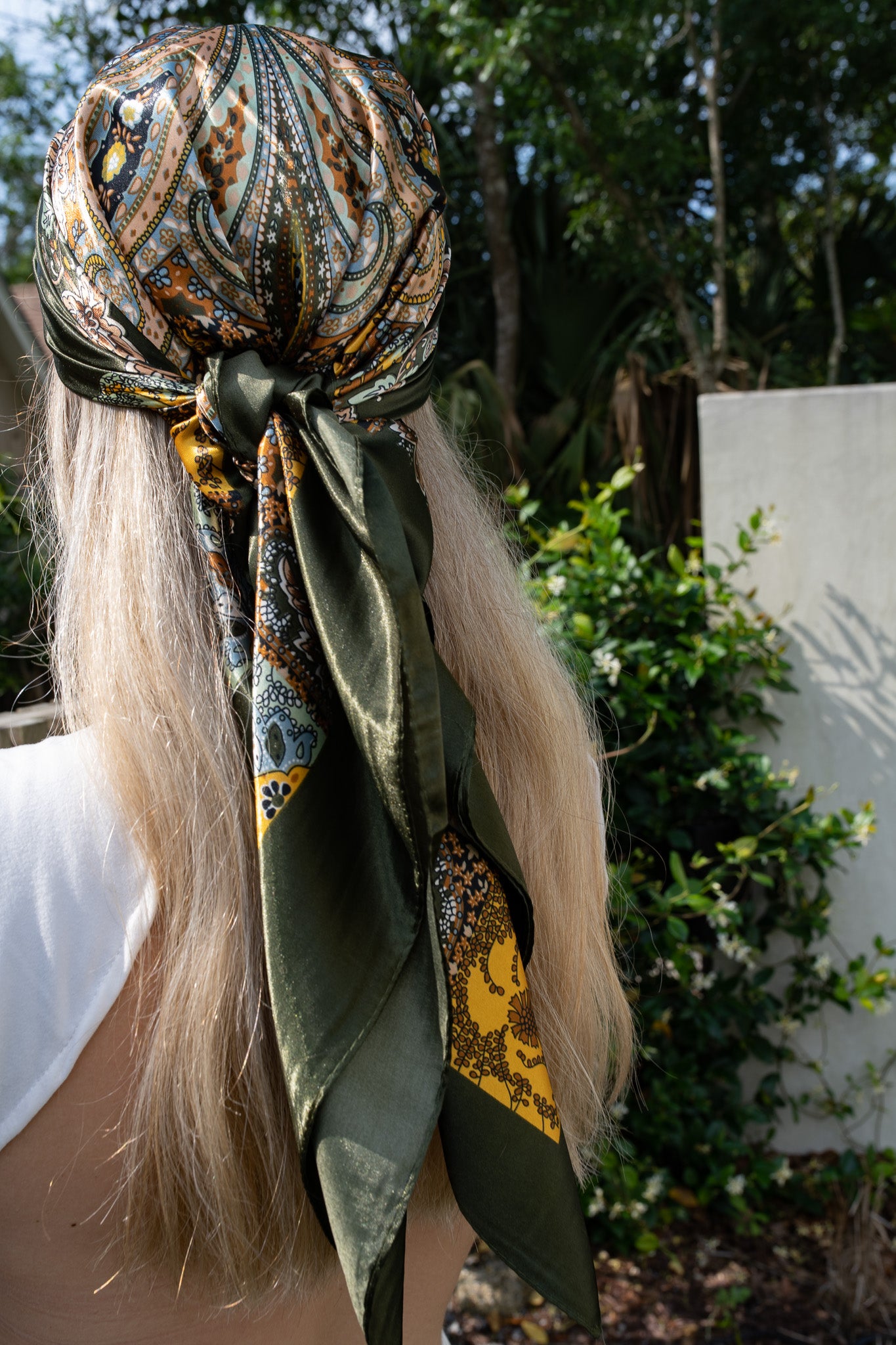This style is not only beautiful but it is versatile and chic! This scarf can be worn as a top, on your bag, around your neck, or in your hair! The possibilities are endless with this silk like scarf as you find ways to incorporate this style.