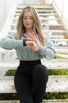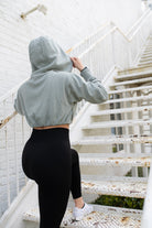 Introducing the perfect piece to your athleisure look. This cropped hoodie features a cinched waistline, big hood, cuffed sleeves, and a wide V-neck