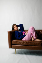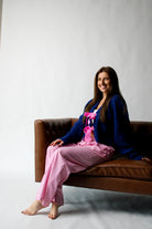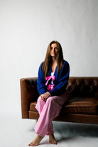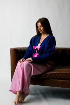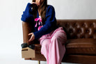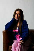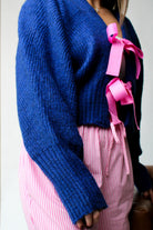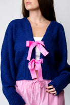 Introducing the Blue Bliss Bow Cardigan, a stylish crop sweater in a classic navy color adorned with playful pink bow ties. This cozy cardigan features dolman long sleeves and ribbed cuffs and hem, offering both comfort and flair. Perfect for layering, it adds a fun, feminine touch to any outfit!