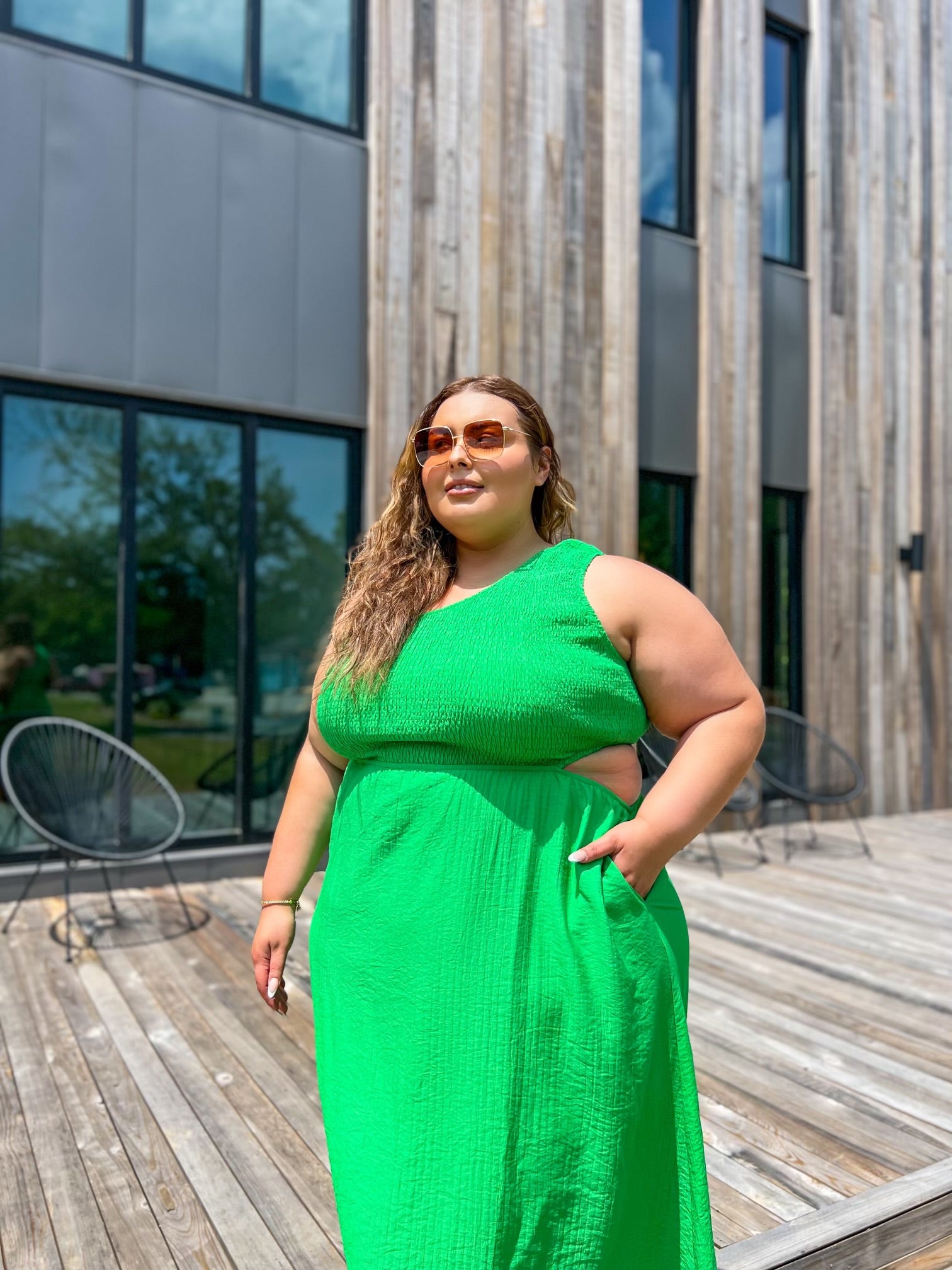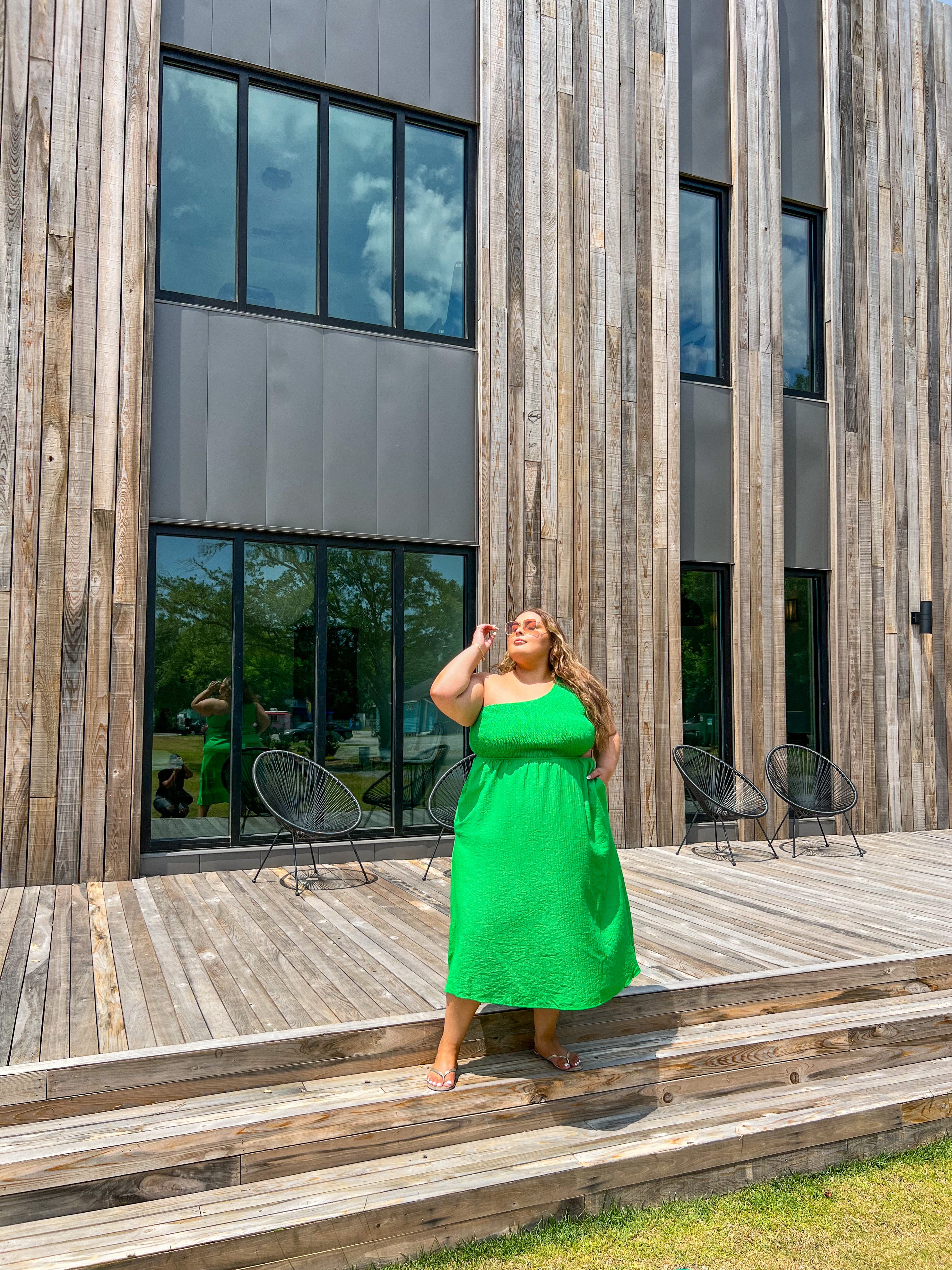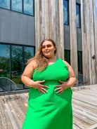 A striking midi dress option featuring a chic one shoulder design and a daring cut out detail, perfect for making a statement in vibrant green.