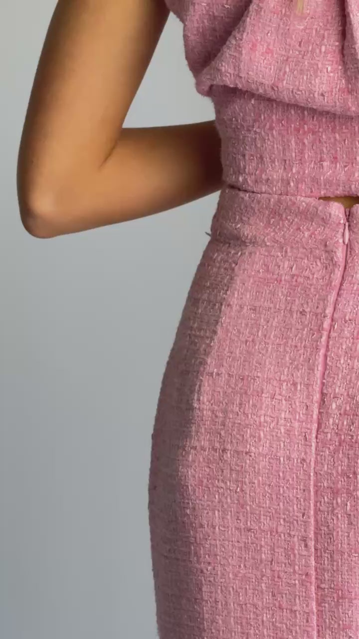 Step into full Elle Woods CEO mode with the Business Barbie Tweed Midi Skirt—a luxe, structured pink tweed piece designed to radiate confidence and main-character energy. Crafted with a no-stretch fit for a sleek, sculpted silhouette, this midi skirt features a chic front slit and faux front pockets for a tailored, fashion-forward look.