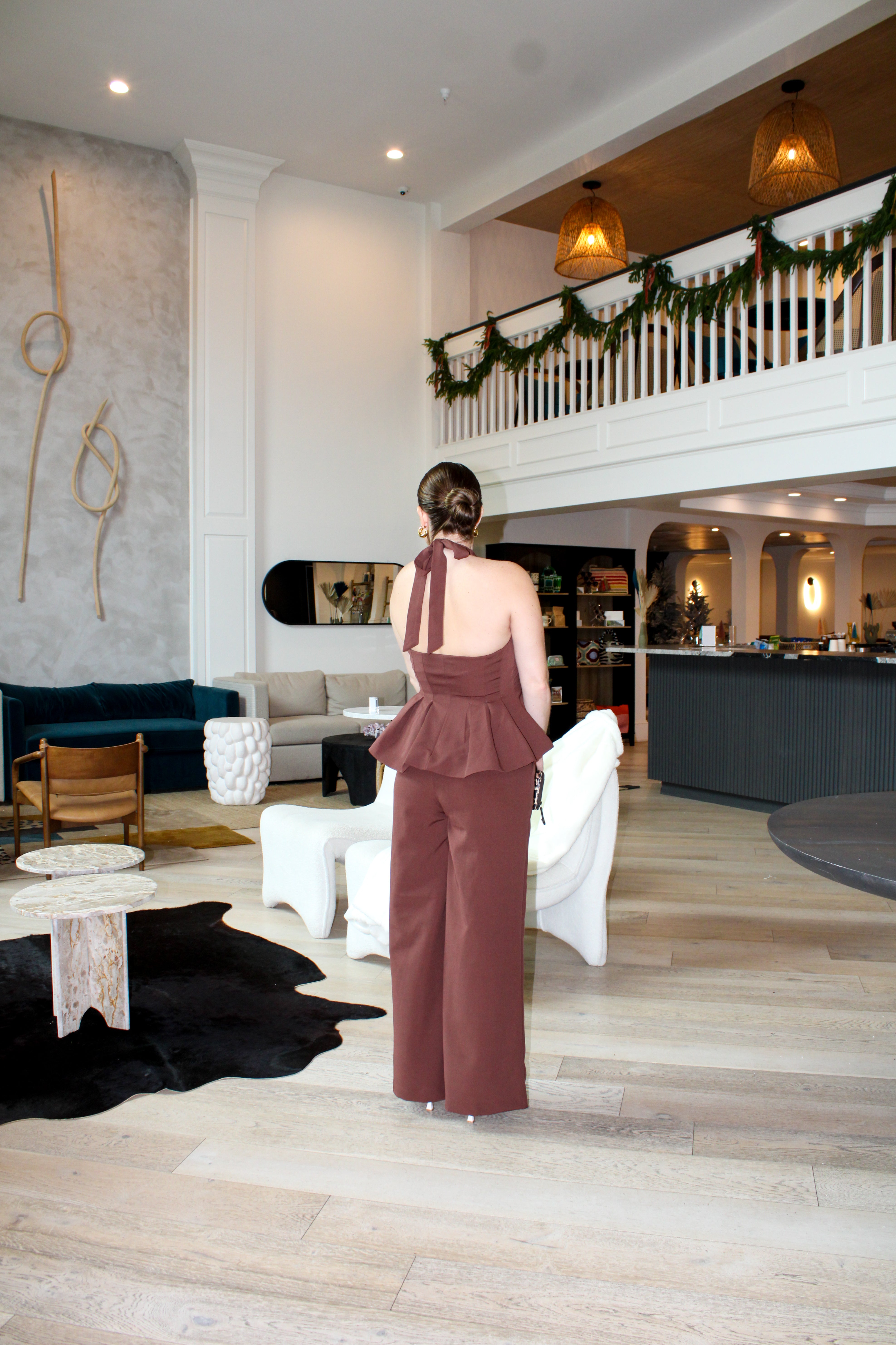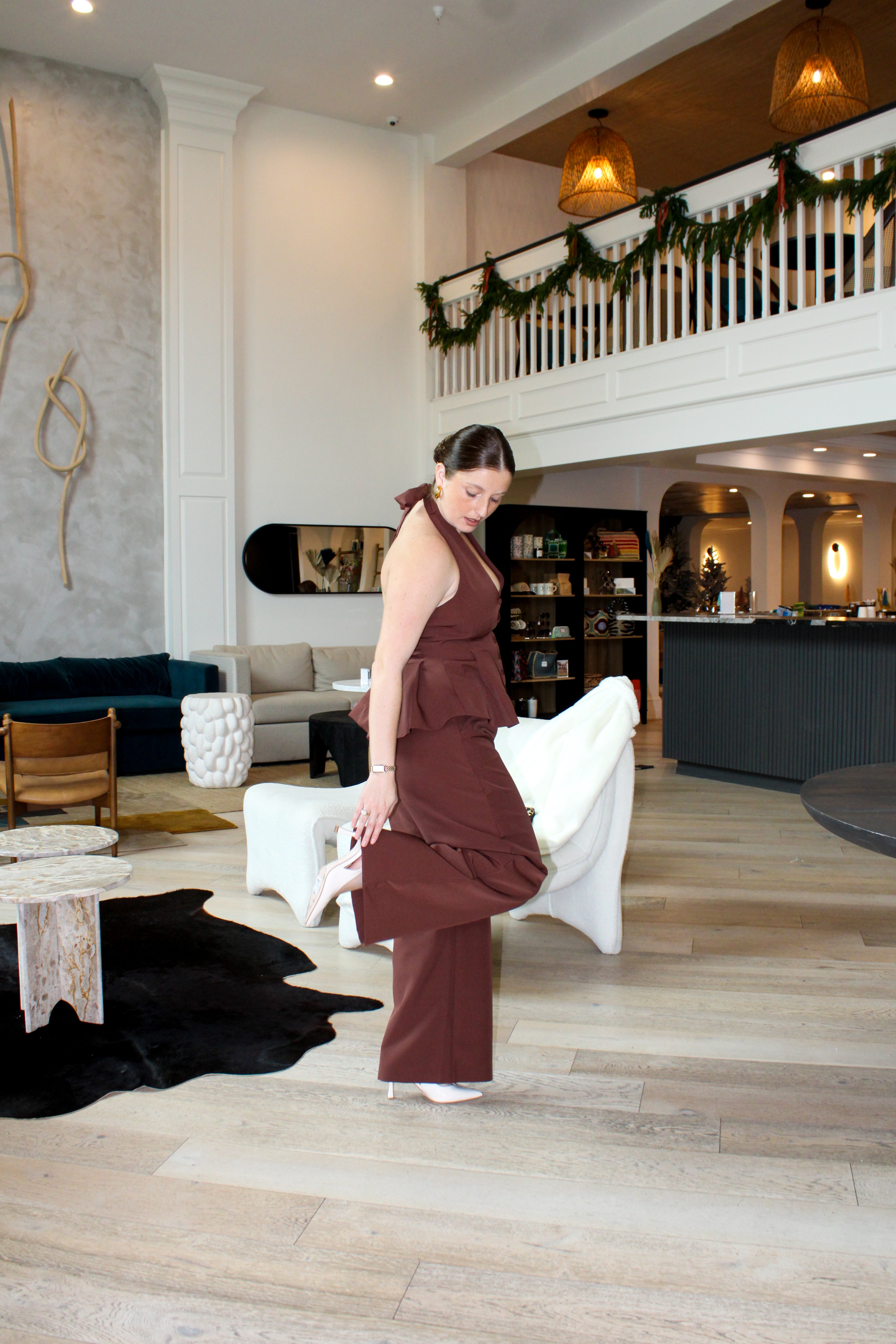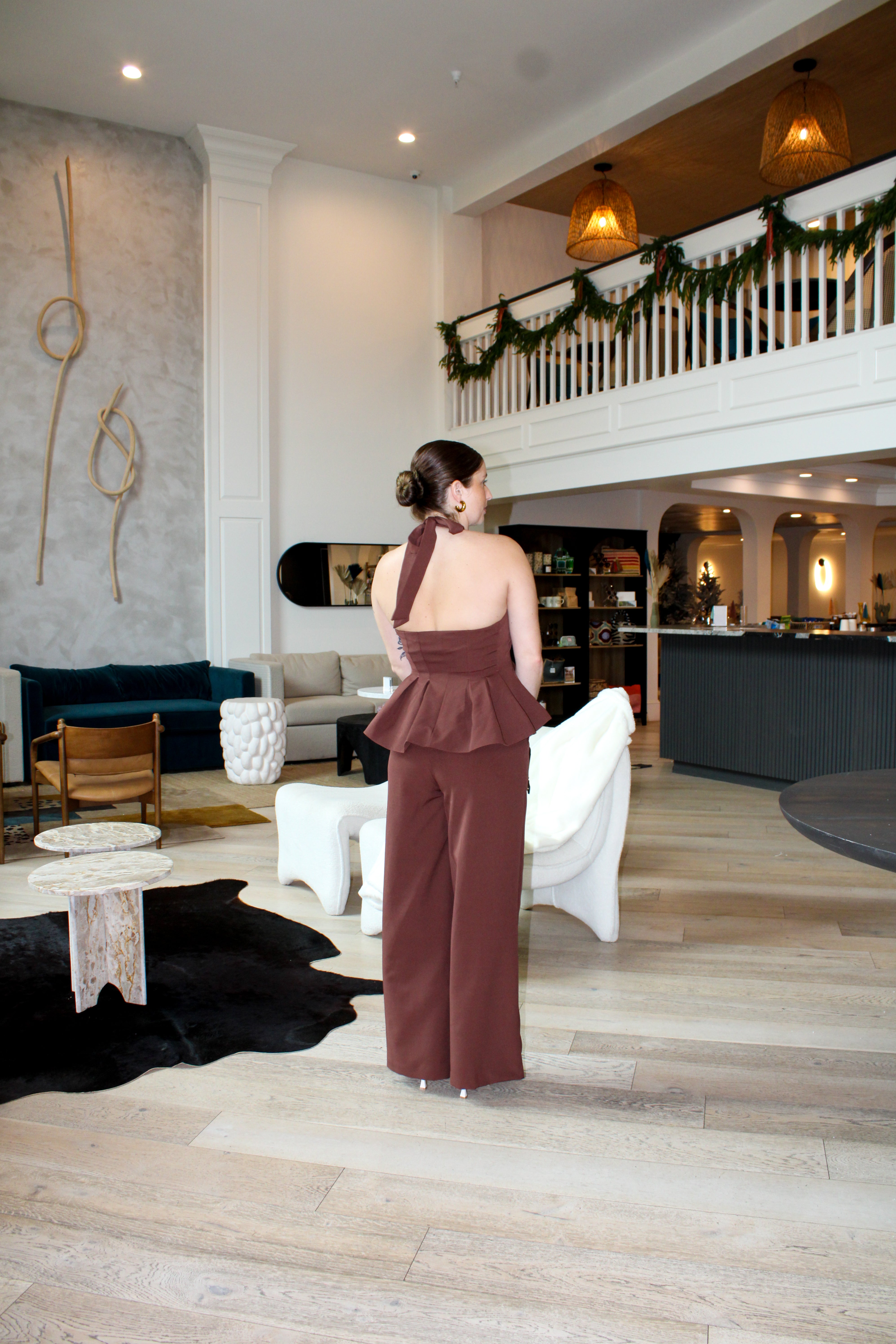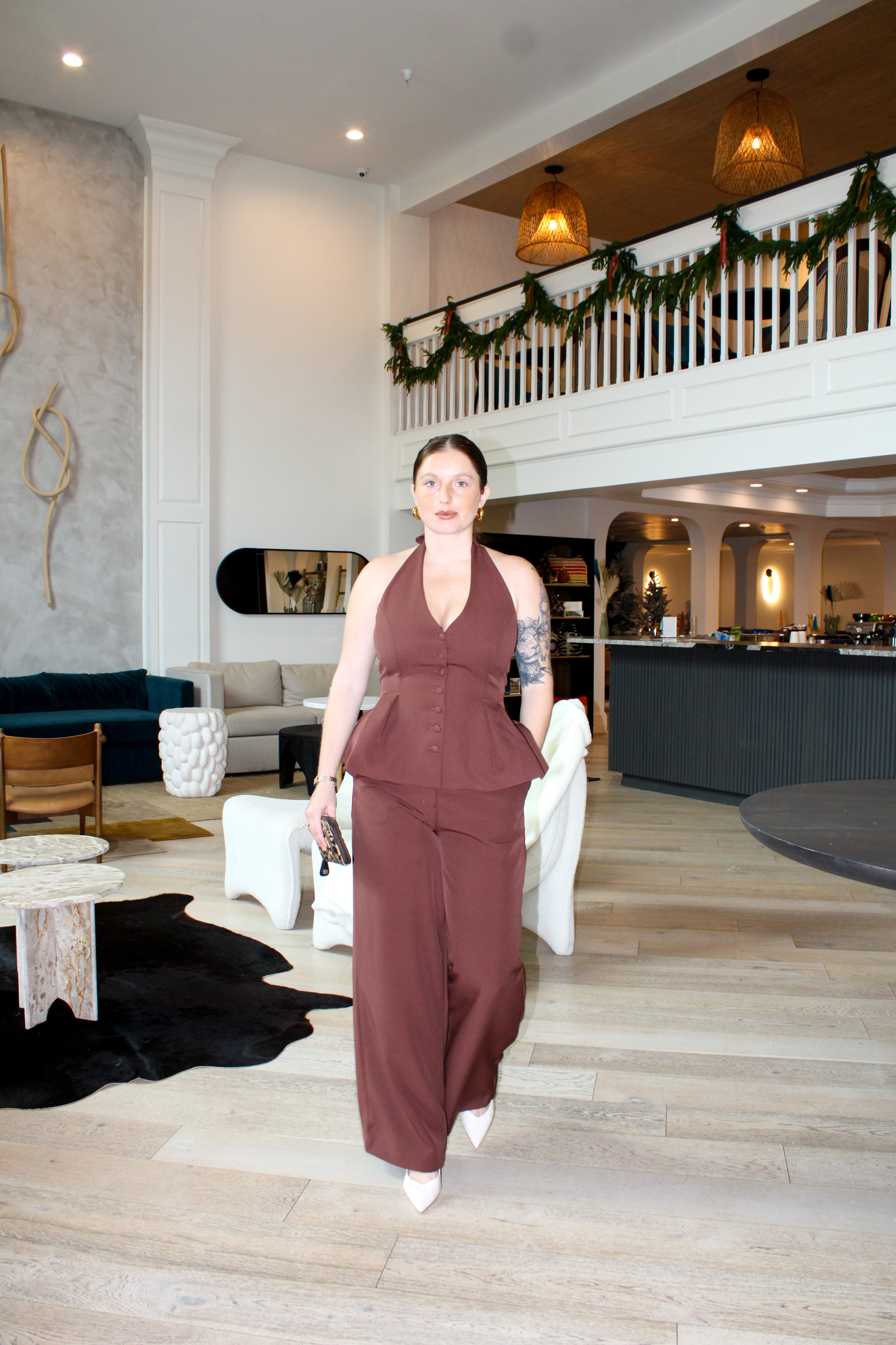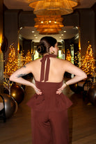 For the woman who means business—but on her own stylish terms. The Cocoa Couture Executive Set pairs a statement halter-neck peplum top with matching chocolate pants, creating a look that’s sharp, feminine, and undeniably eye-catching.