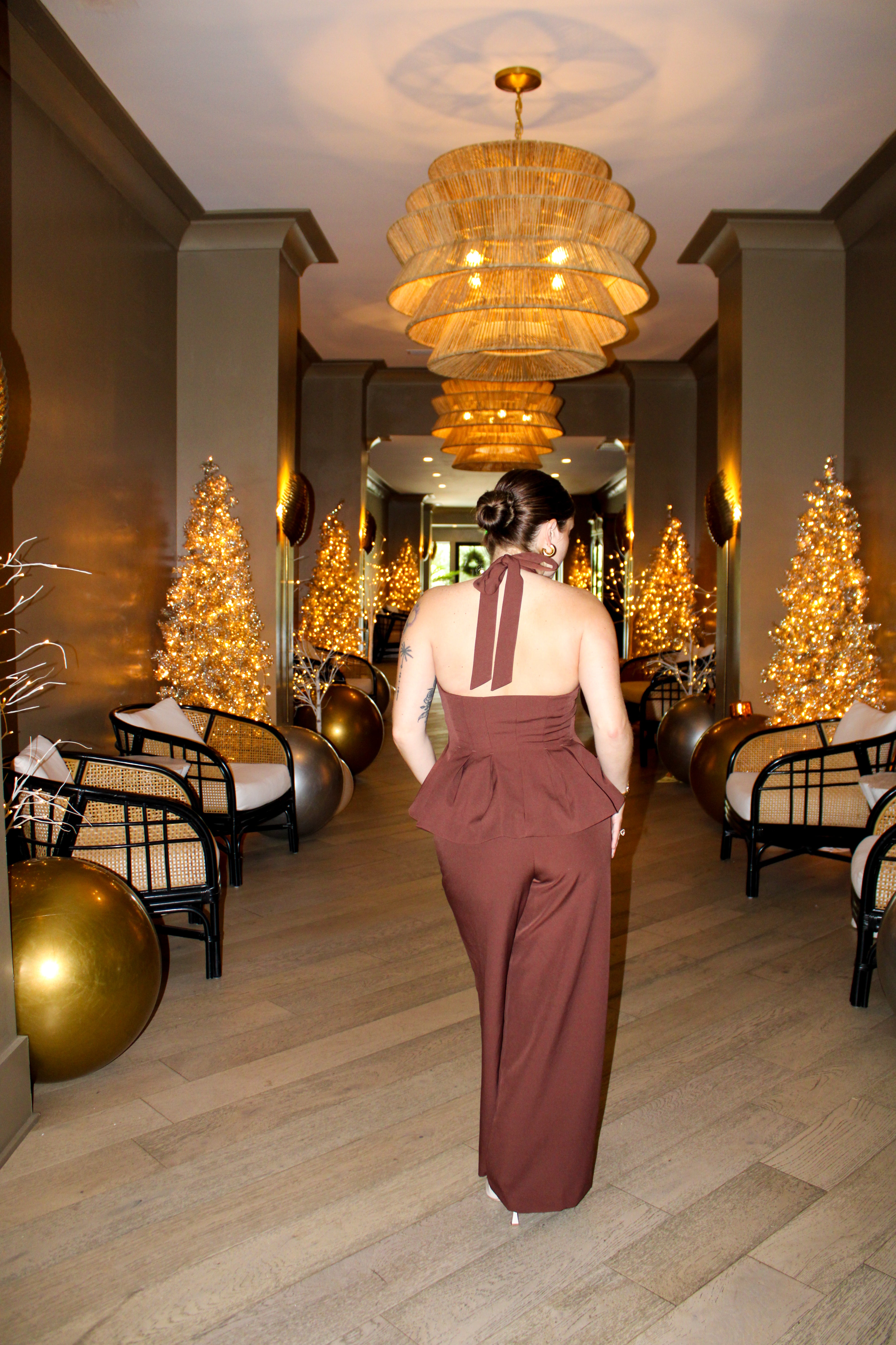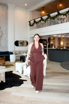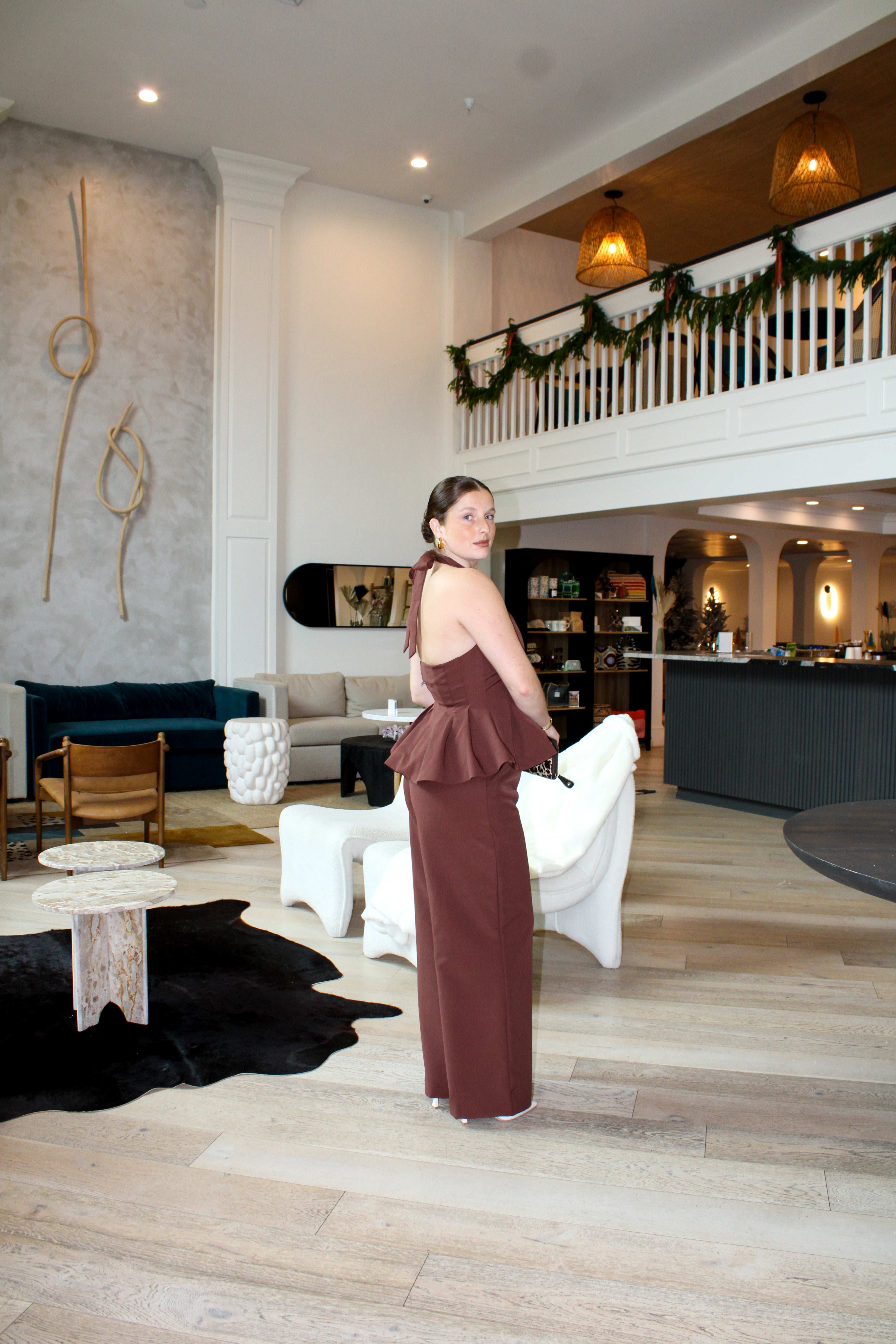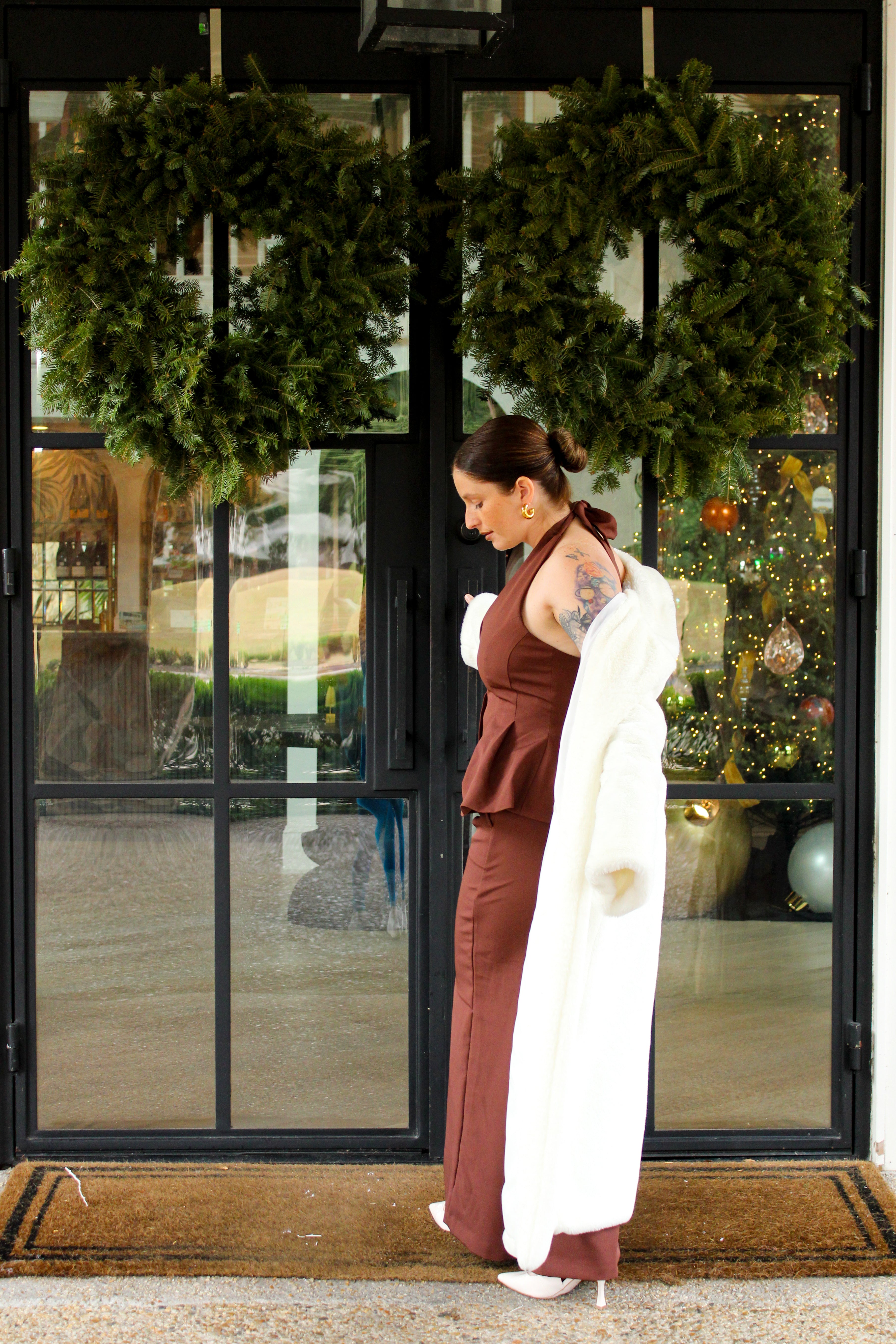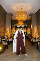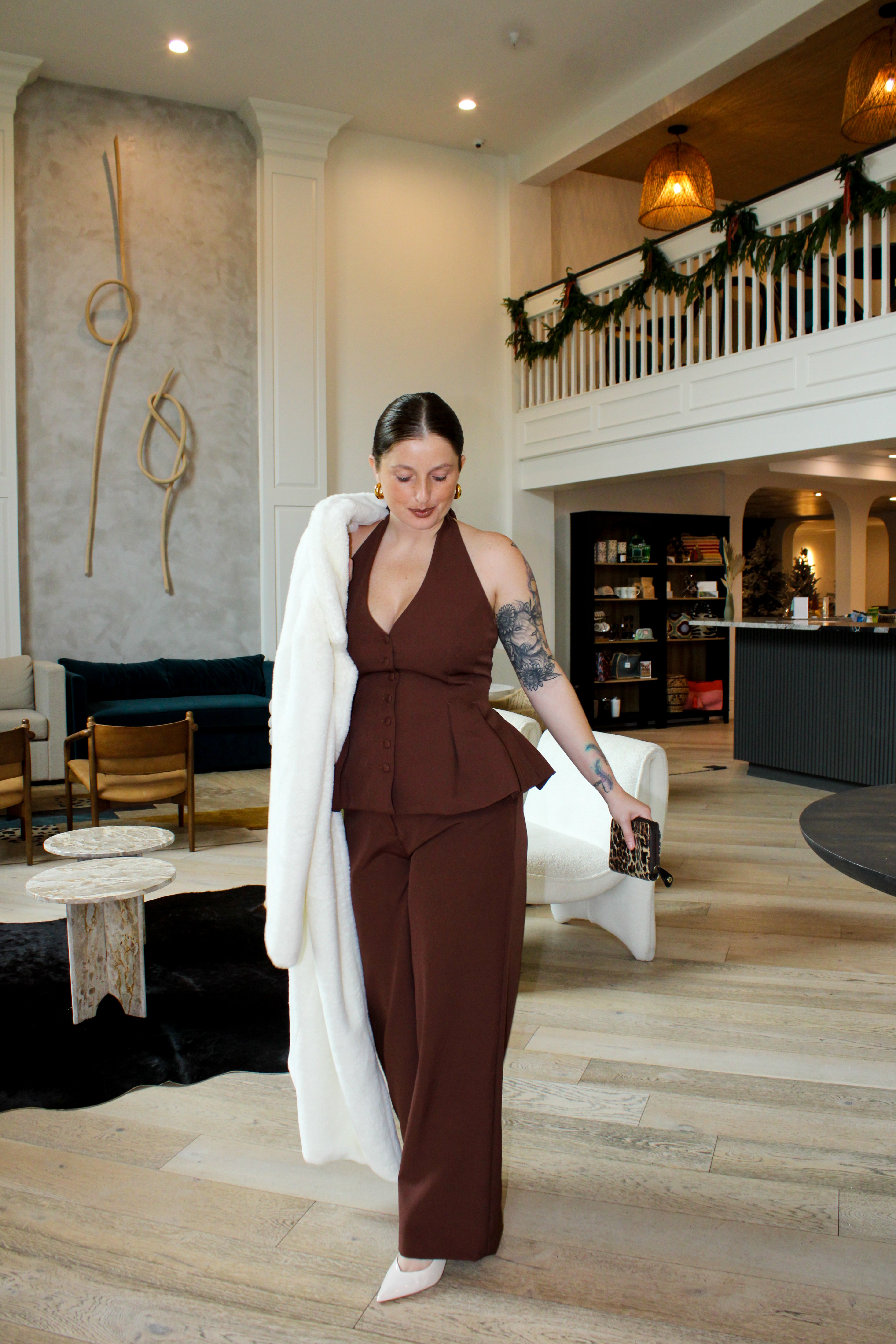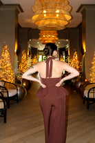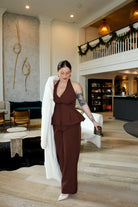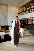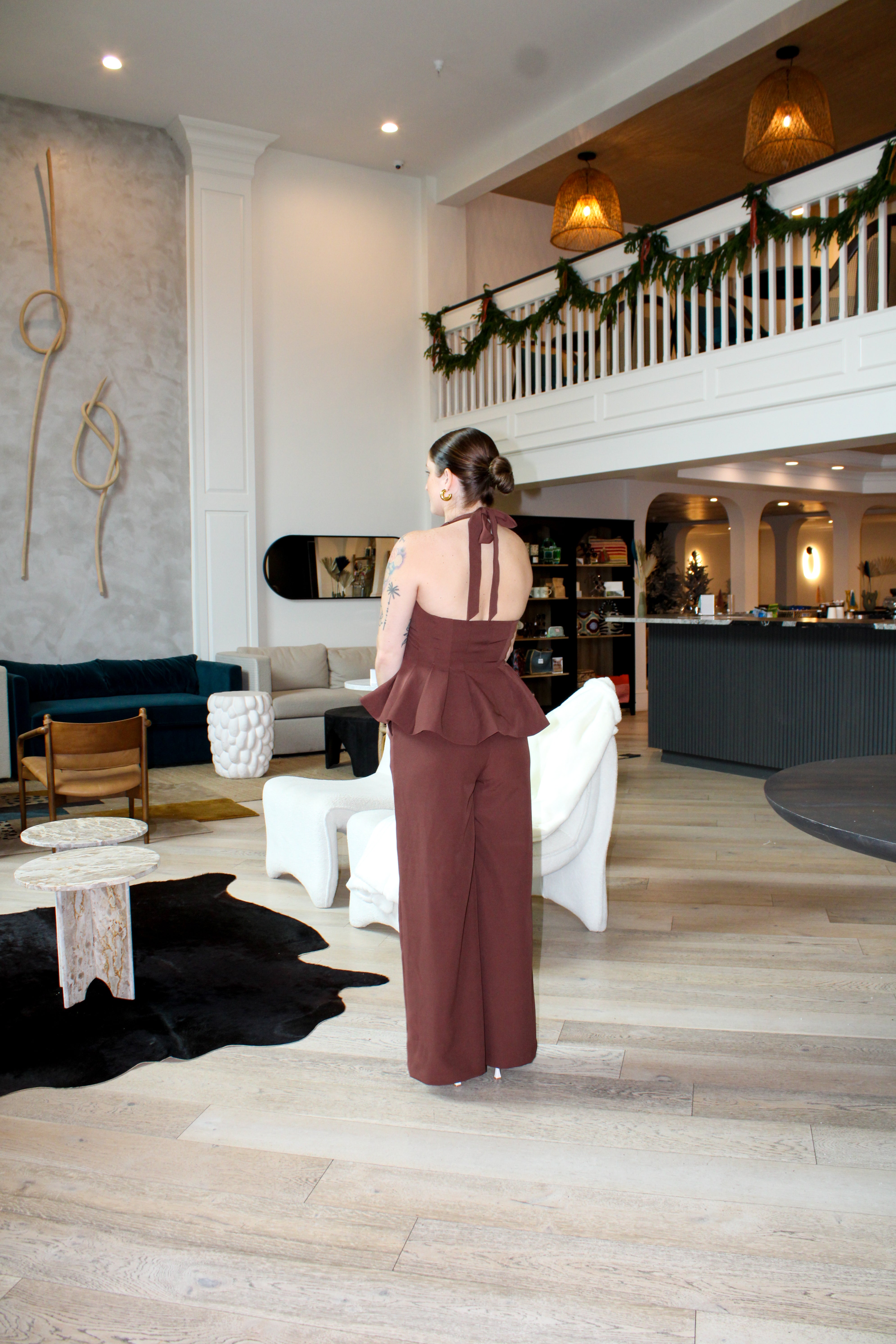 For the woman who means business—but on her own stylish terms. The Cocoa Couture Executive Set pairs a statement halter-neck peplum top with matching chocolate pants, creating a look that’s sharp, feminine, and undeniably eye-catching.
