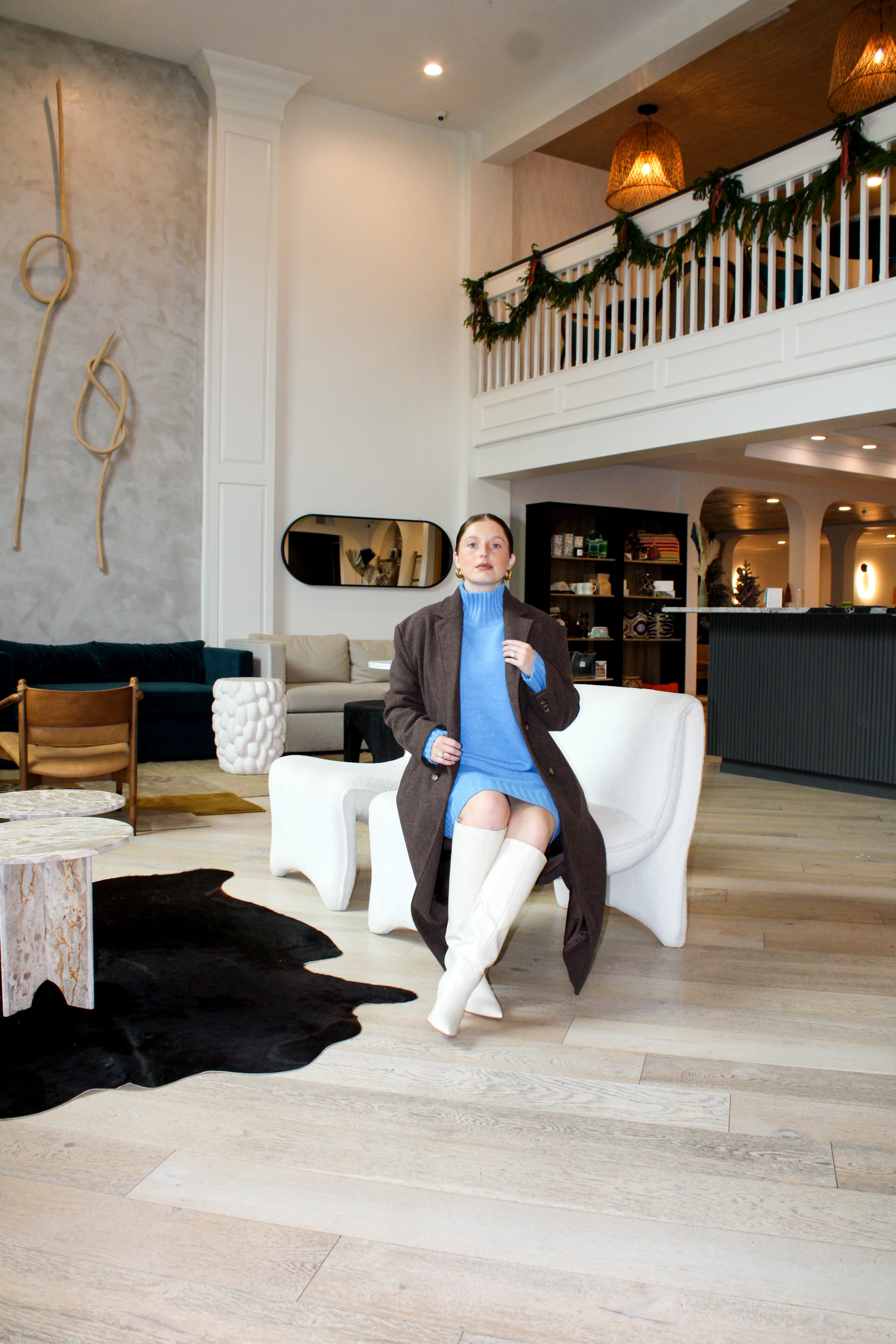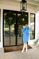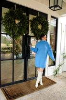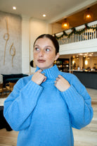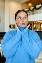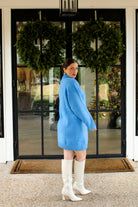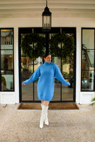 Introducing the Frosted Kissed Midi Sweater—a beautifully soft turtleneck sweater dress in a serene frost-blue hue. With long sleeves and a tunic-style midi fit.