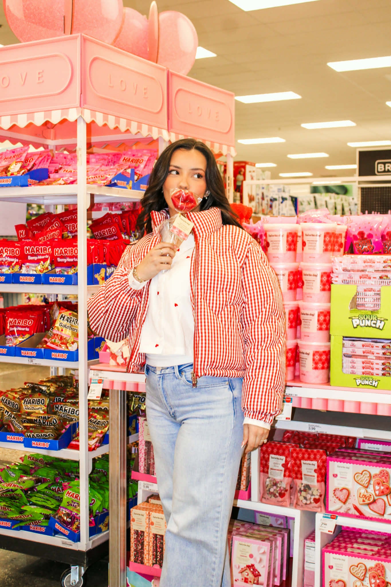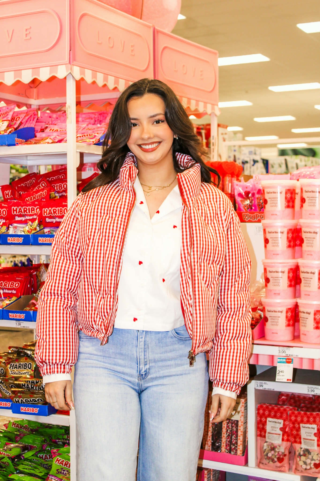 The Gingham By Valentine Puffer combines cozy warmth with charming detail. This red and white puffer jacket features a beautiful embroidered heart design and a classic gingham-inspired look. Functional pockets with button closures keep your essentials secure, while the adjustable sides allow you to customize the fit for added comfort and shape.