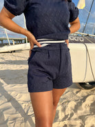 Complete your ensemble with our Navy Sailor Top. Individually stunning, yet together, they create a harmonious symphony of style. Embrace versatility and elegance with this navy blue diamond stitched set, where every detail is crafted to perfection.