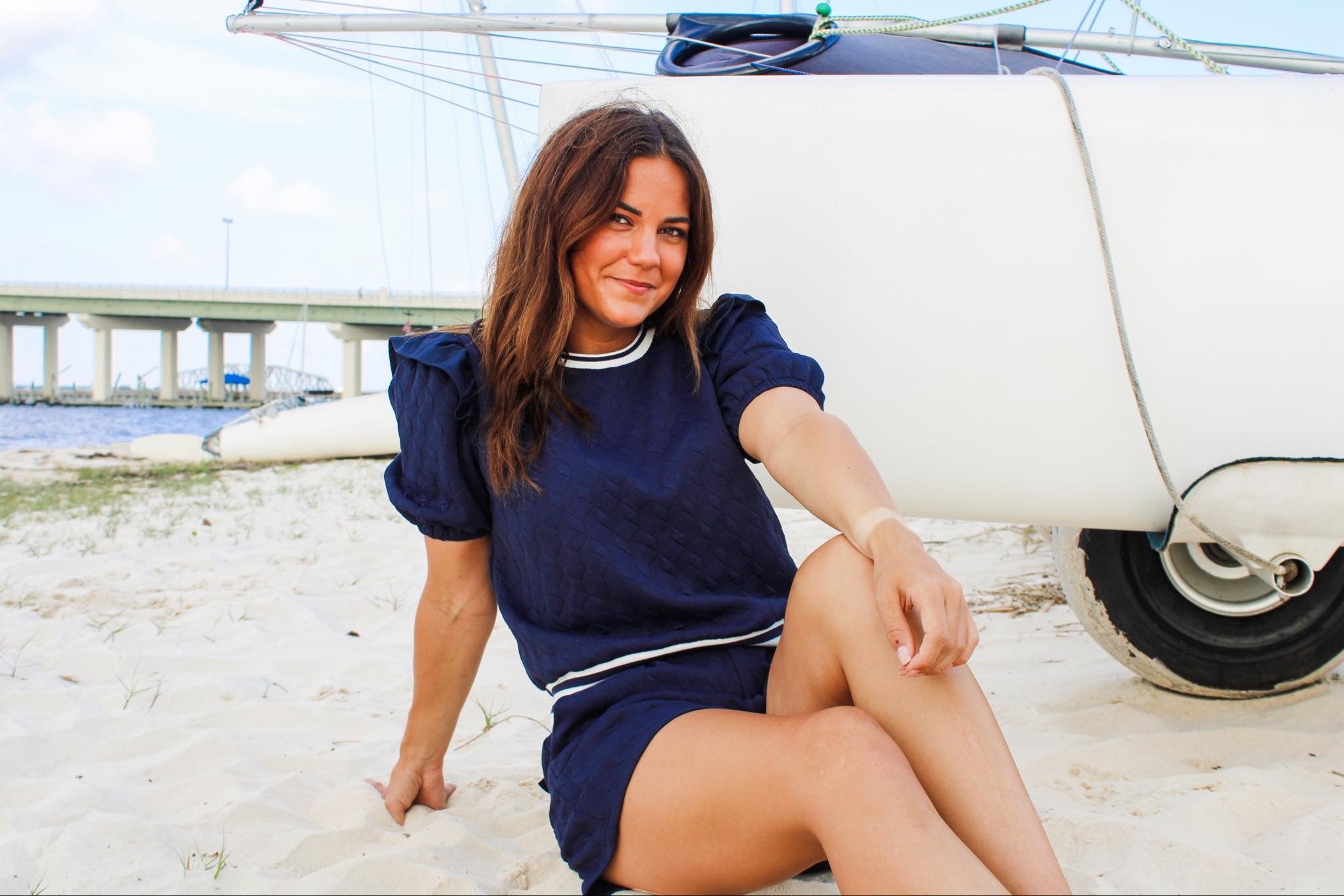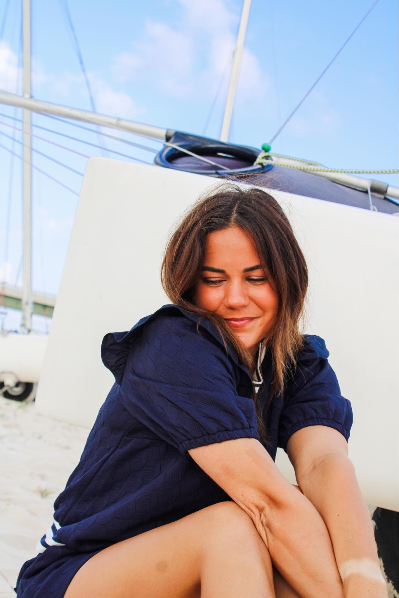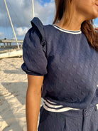 Introducing our Navy Sailor Top, adorned with a mesmerizing diamond-like stitching design. The elegant white stripes along the neckline and bottom add a touch of contrast and chic flair. Embrace femininity with delicate puff short sleeves featuring a subtle ruffle accent, while the fitted waistline ensures a flattering silhouette. Perfect for any patriotic celebration or casual affair.