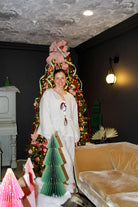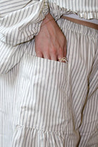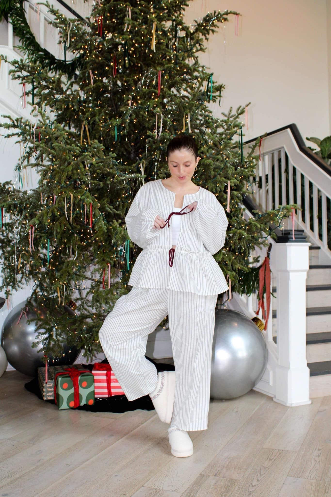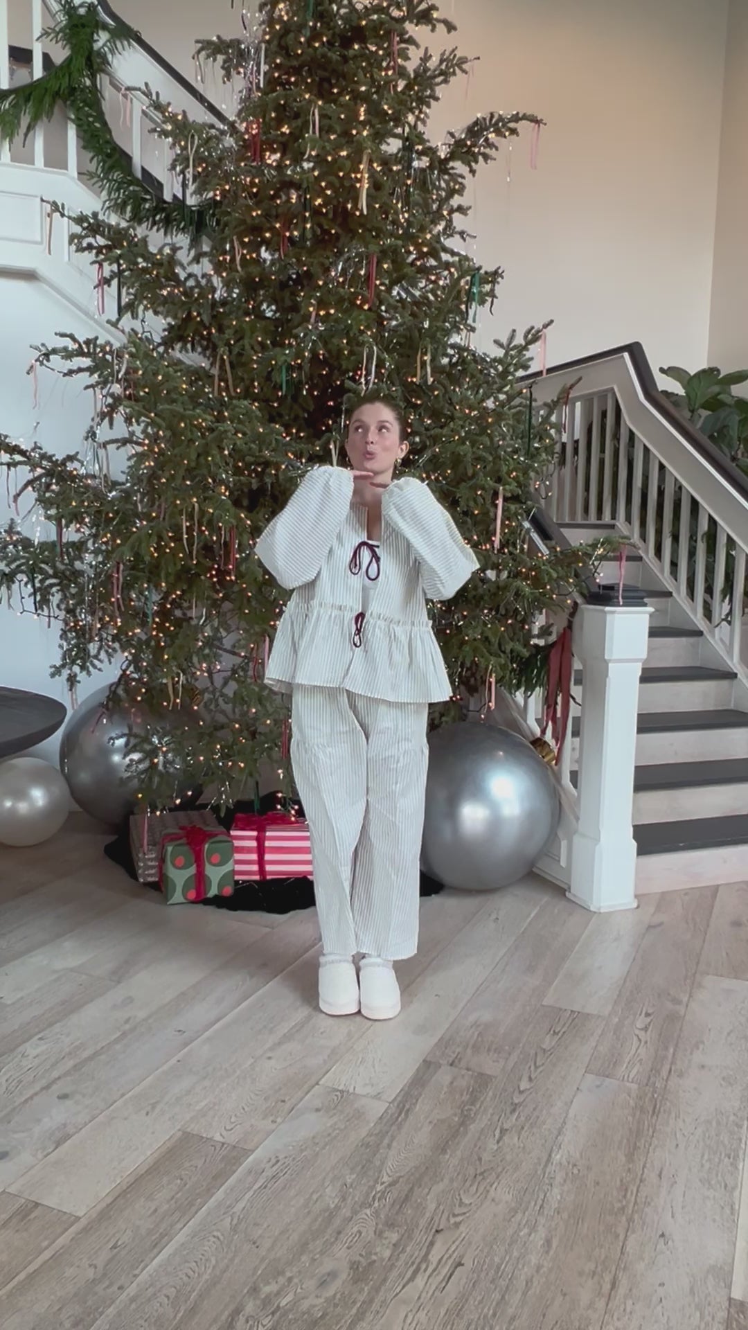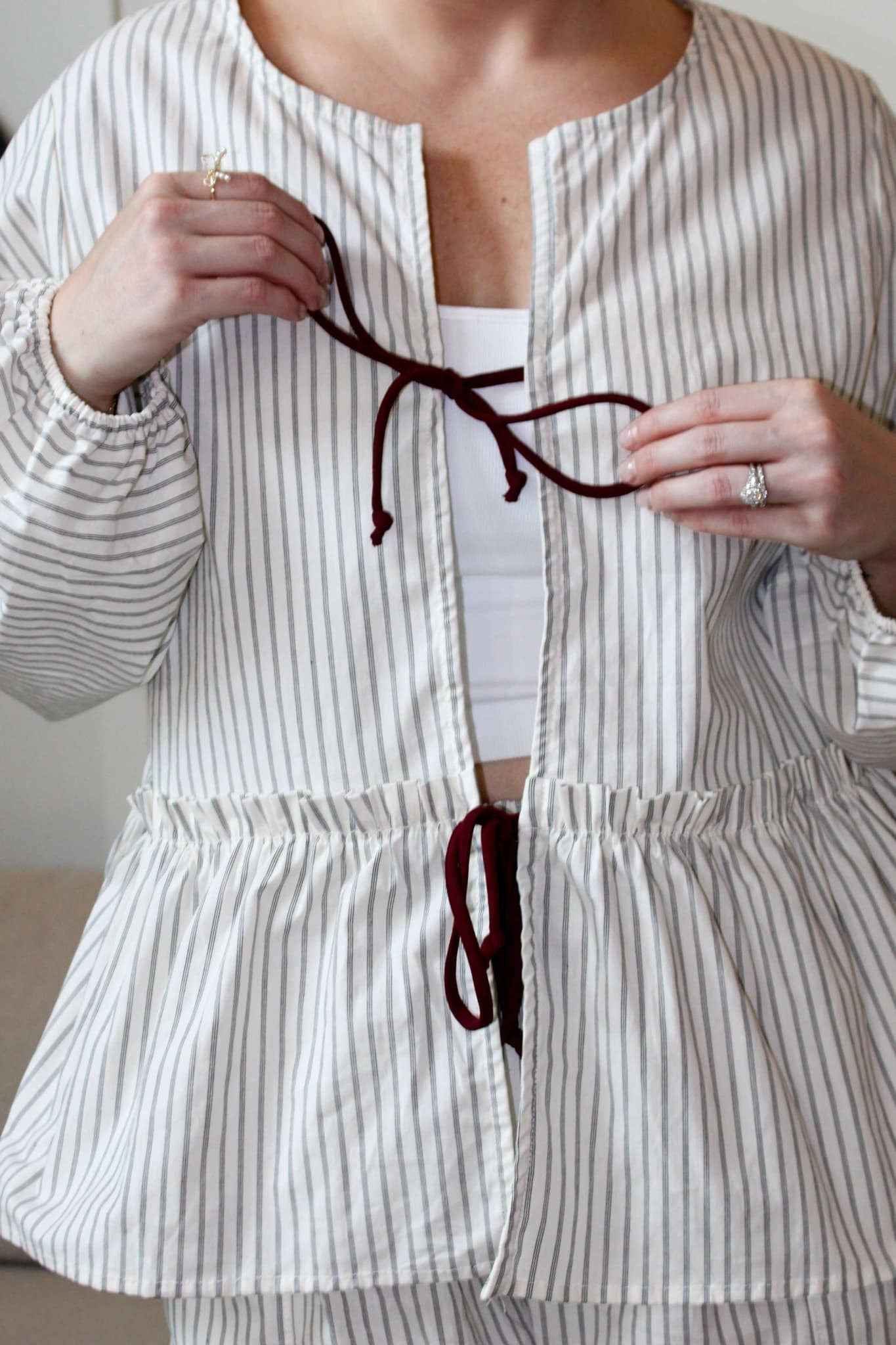 - Top: The blouse features a soft, ruffled design with a cute front bow tie, creating a relaxed and feminine look. The striped print adds a touch of playful charm while keeping things cozy.