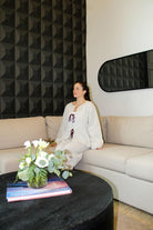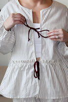 - Bottom: The pants come with a contrast drawstring waist and a matching stripe pattern, offering both comfort and a flattering fit for all-day wear.