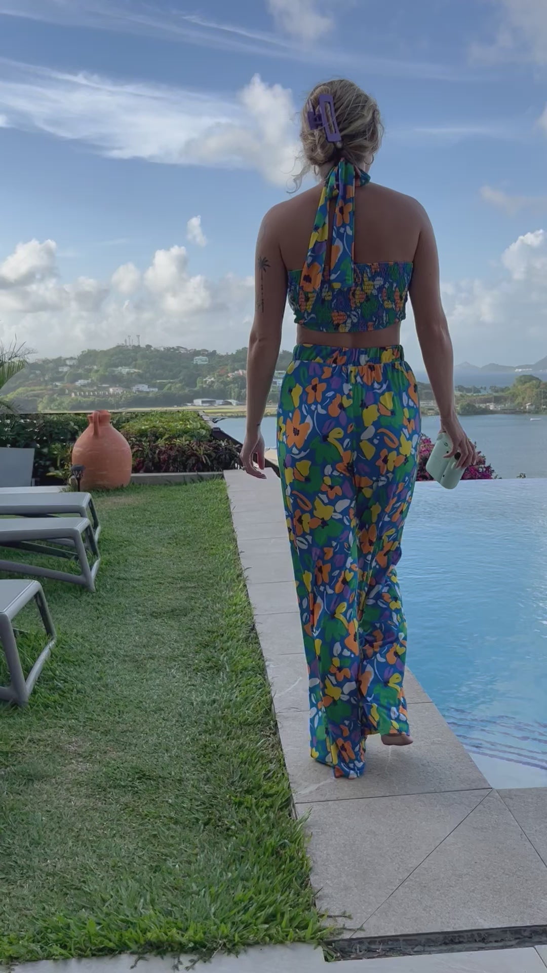Introducing your next floral set featuring a colorful floral design from top to bottom, wide leg pants, and a matching cropped tank that can be worn as a bandeau or halter top.