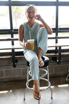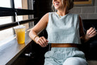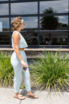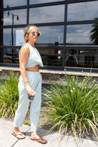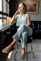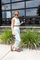 Set featuring a cropped top and capri length pants set. The top has a single button back closure with a tank fit. The bottoms are slightly high waisted with an elastic waistband and working pockets. This set also features a natural wrinkle look.