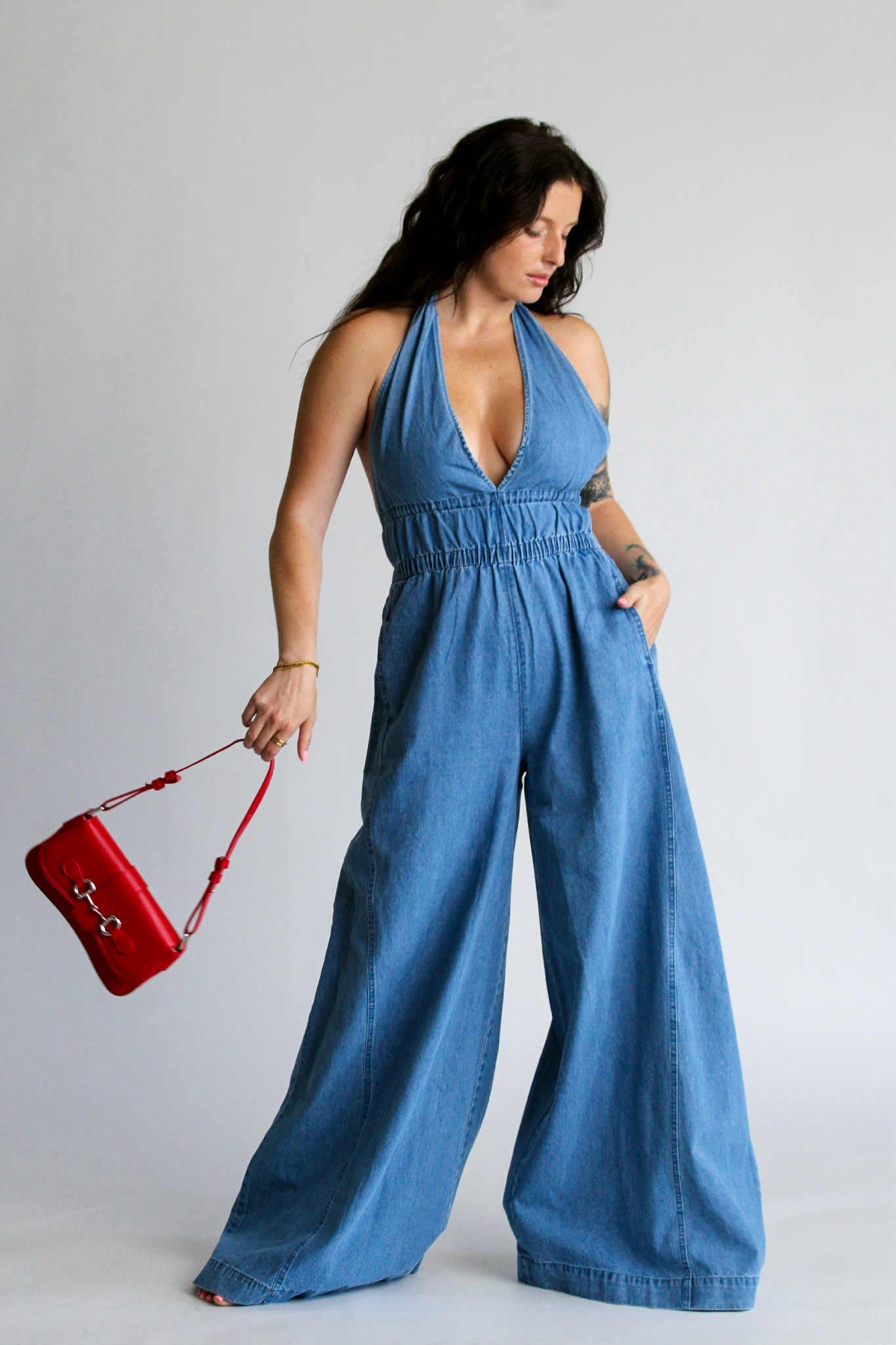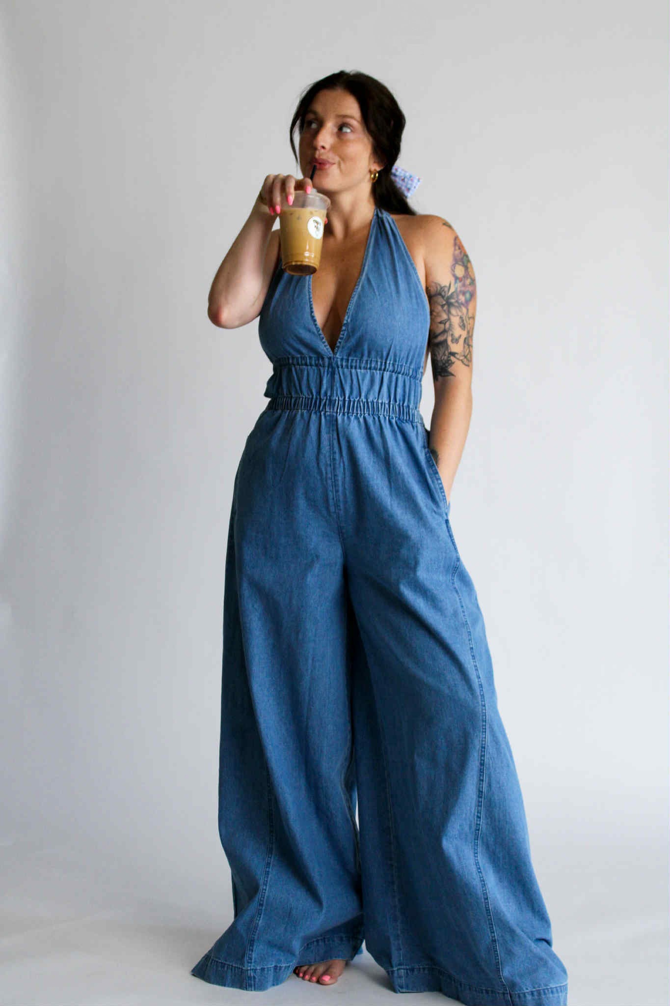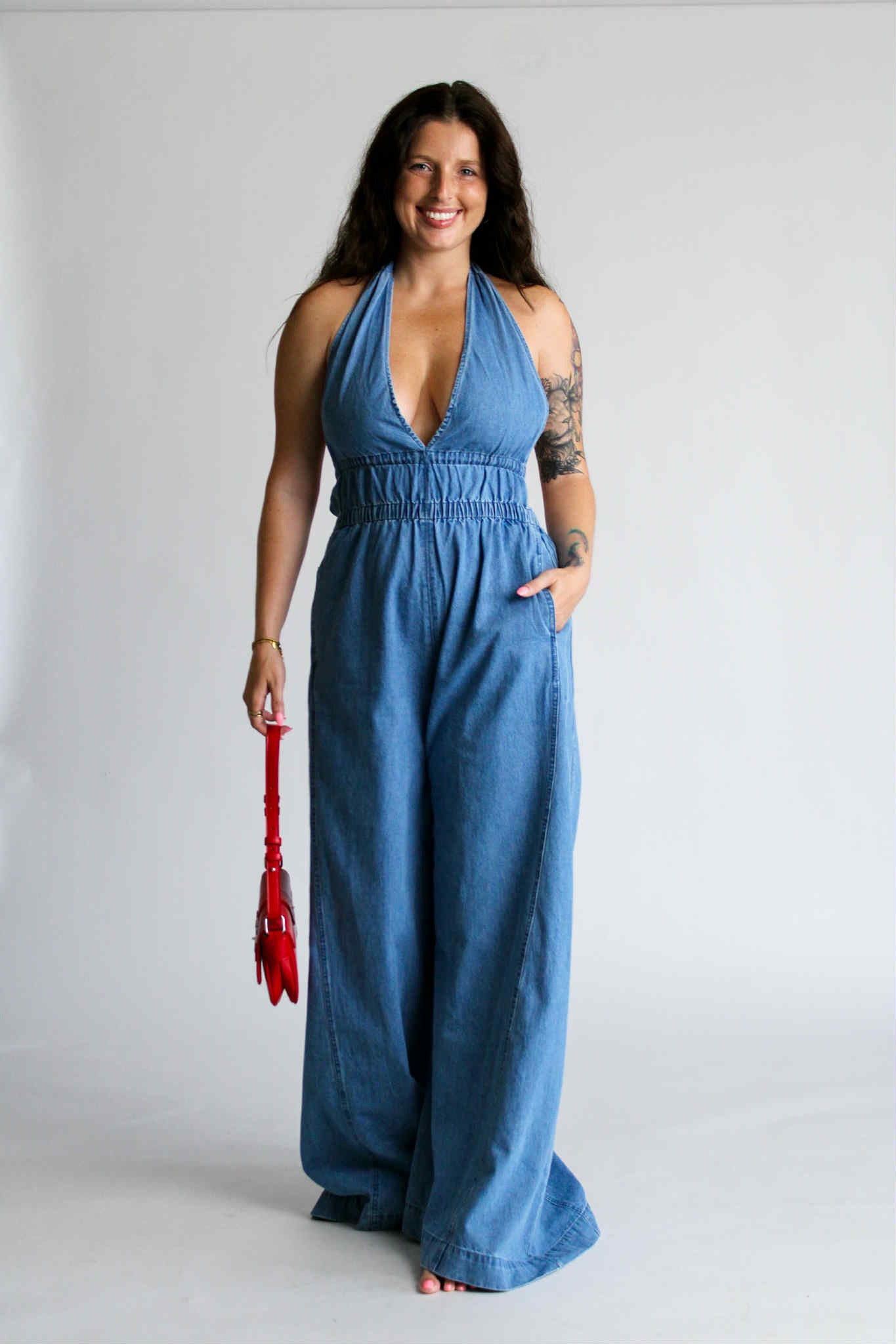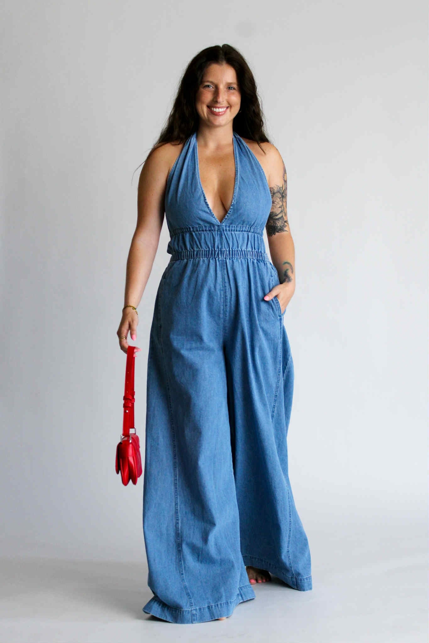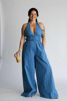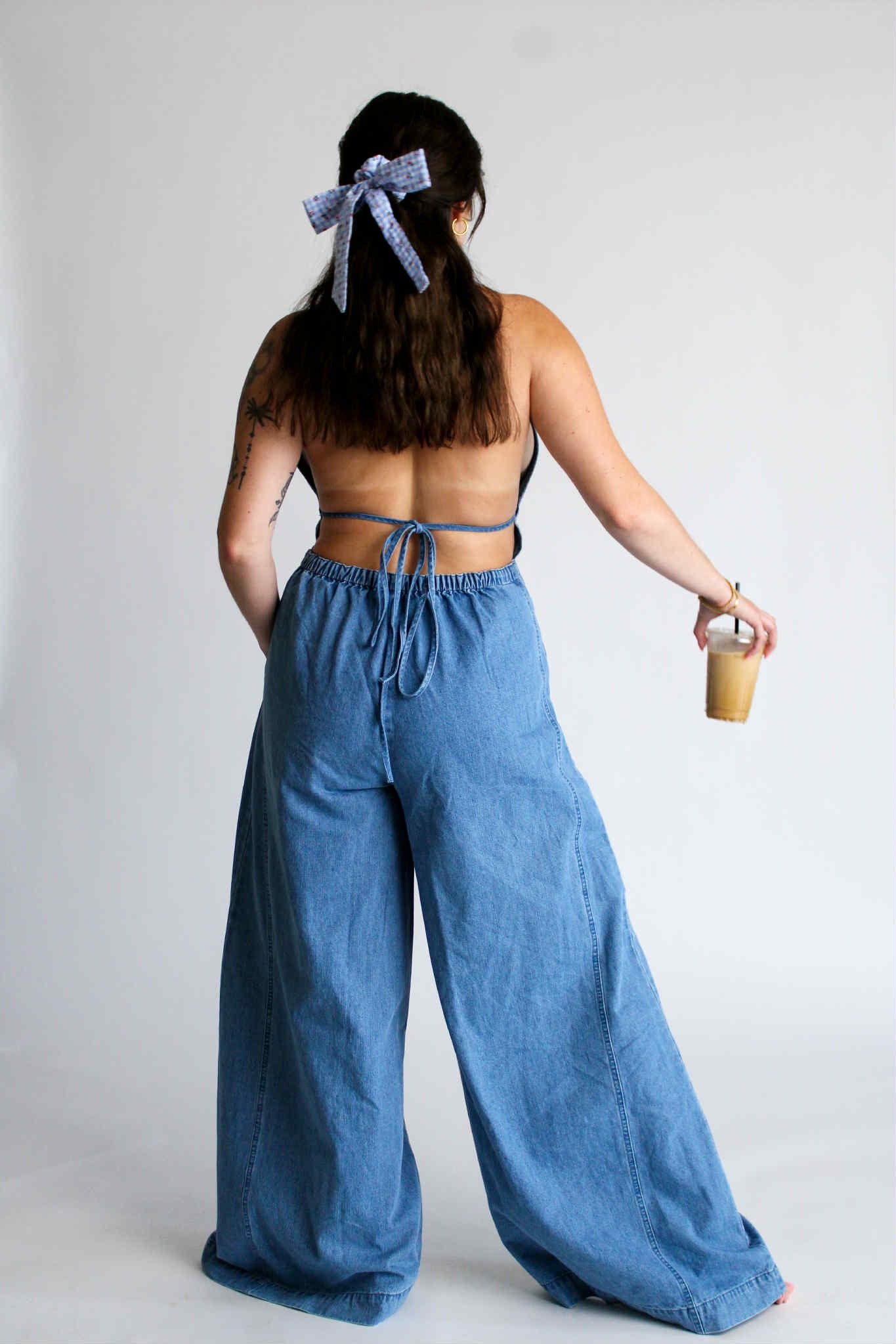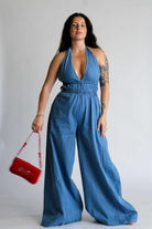 Introducing our Bareback Beauty Jumpsuit – your new summer showstopper. Featuring an adjustable halter neck and a sultry deep V neckline, this high-waisted, wide-leg jumpsuit flatters every curve. The open back and wide elastic waistband that ties in the back give you the perfect adjustable fit. Made from lightweight summer denim, this piece is breathable, bold, and effortlessly stylish.
