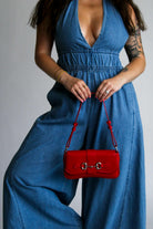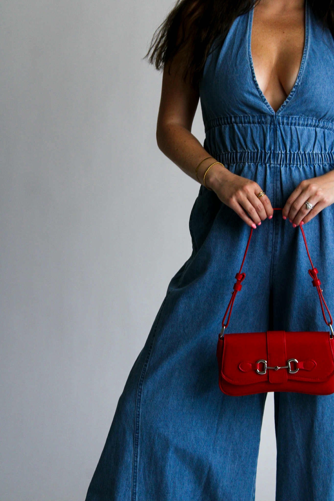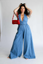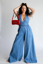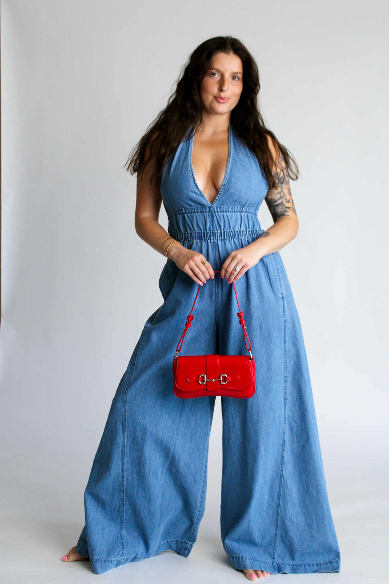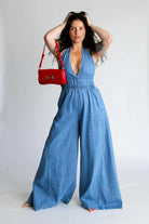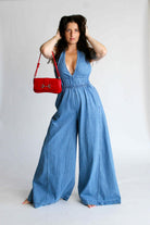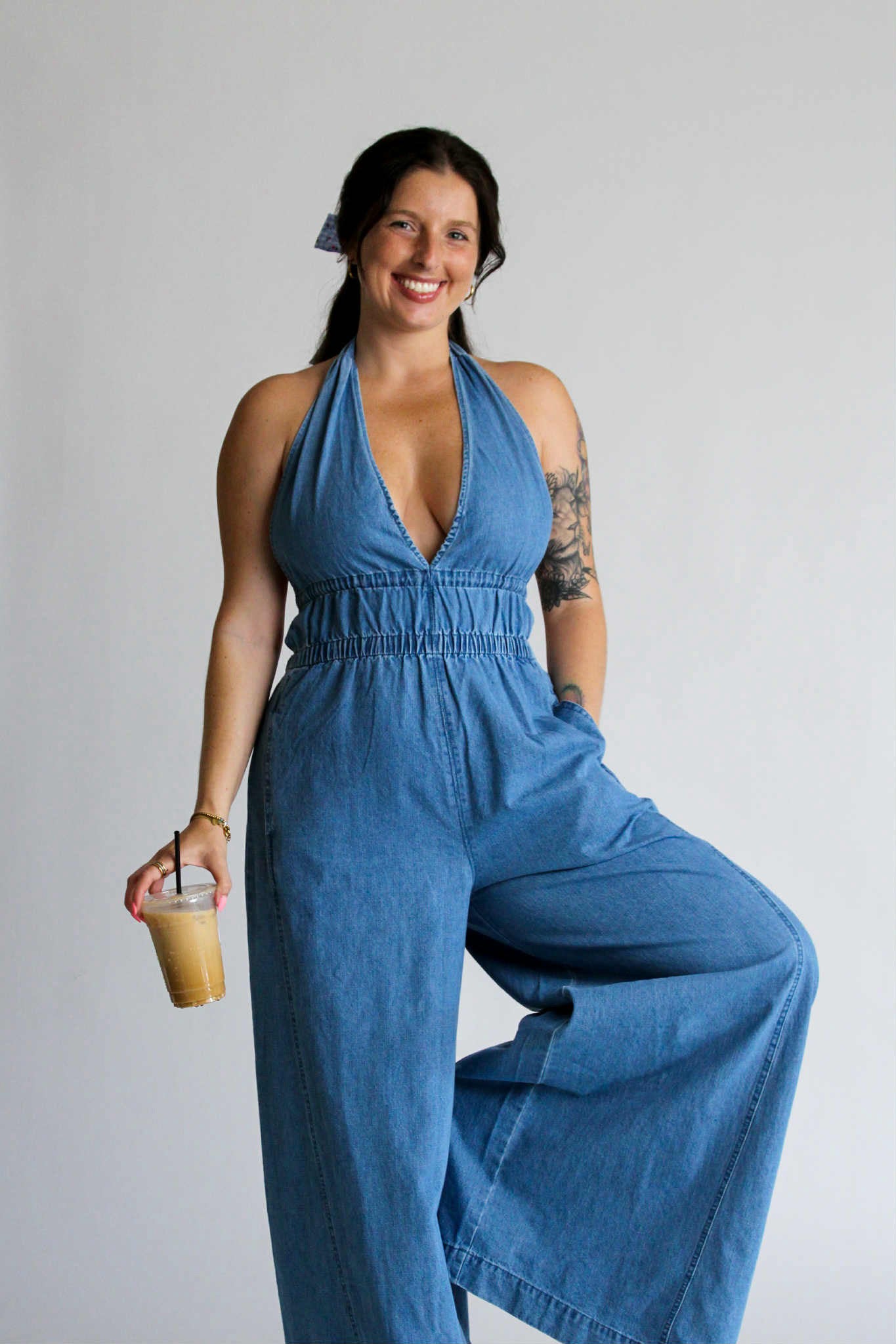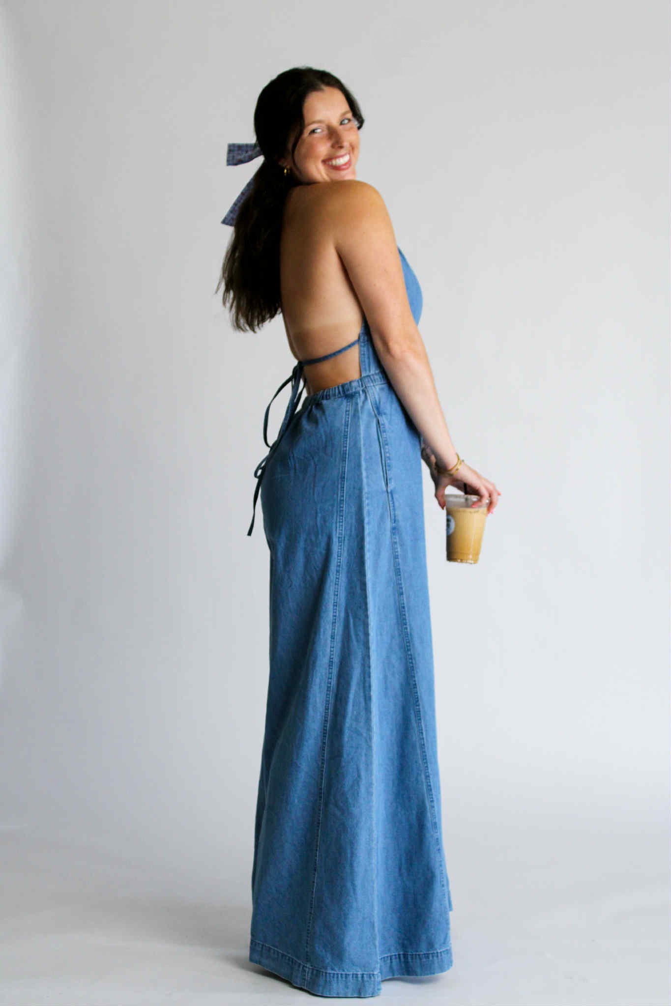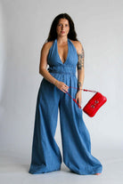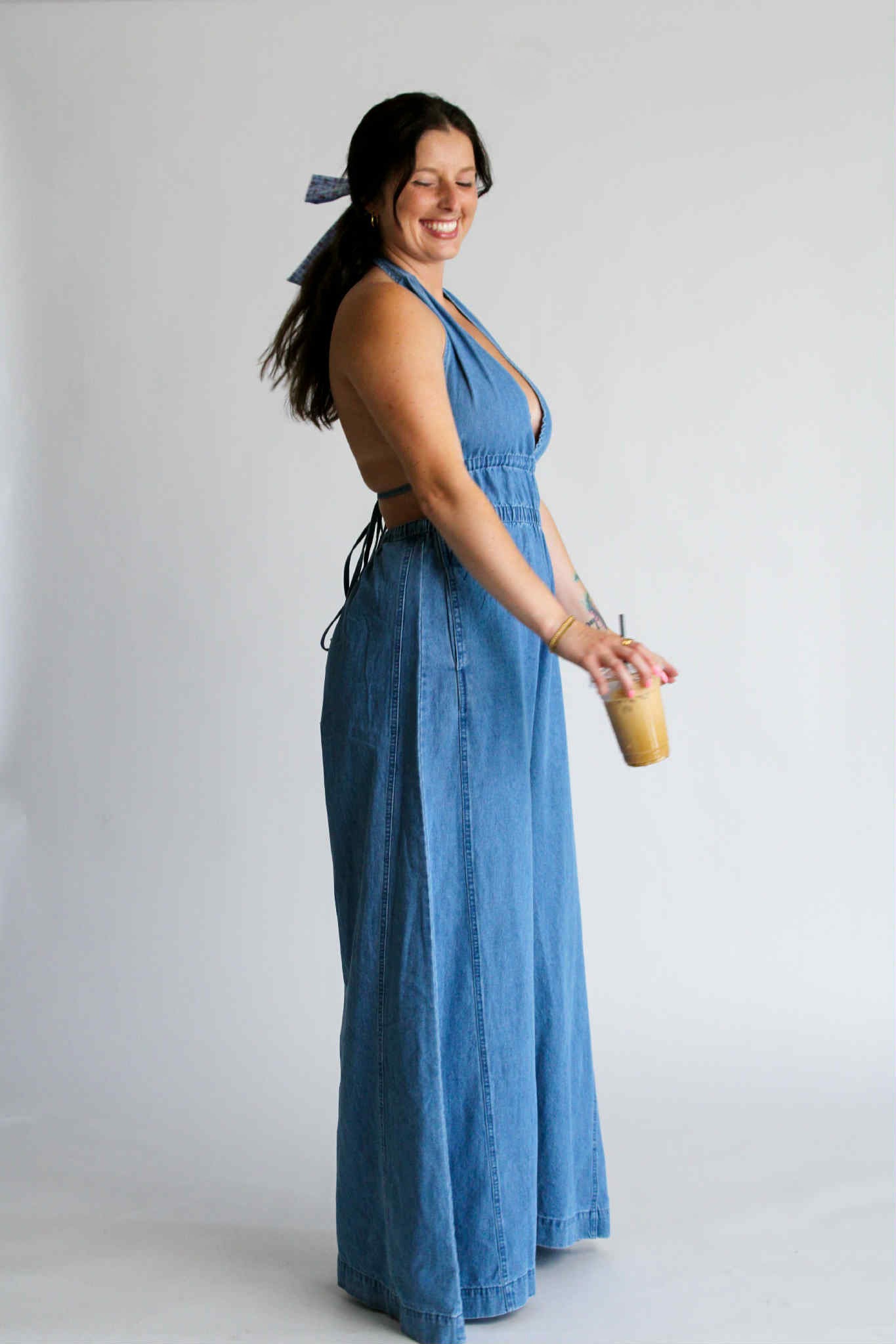 Introducing our Bareback Beauty Jumpsuit – your new summer showstopper. Featuring an adjustable halter neck and a sultry deep V neckline, this high-waisted, wide-leg jumpsuit flatters every curve. The open back and wide elastic waistband that ties in the back give you the perfect adjustable fit. Made from lightweight summer denim, this piece is breathable, bold, and effortlessly stylish.