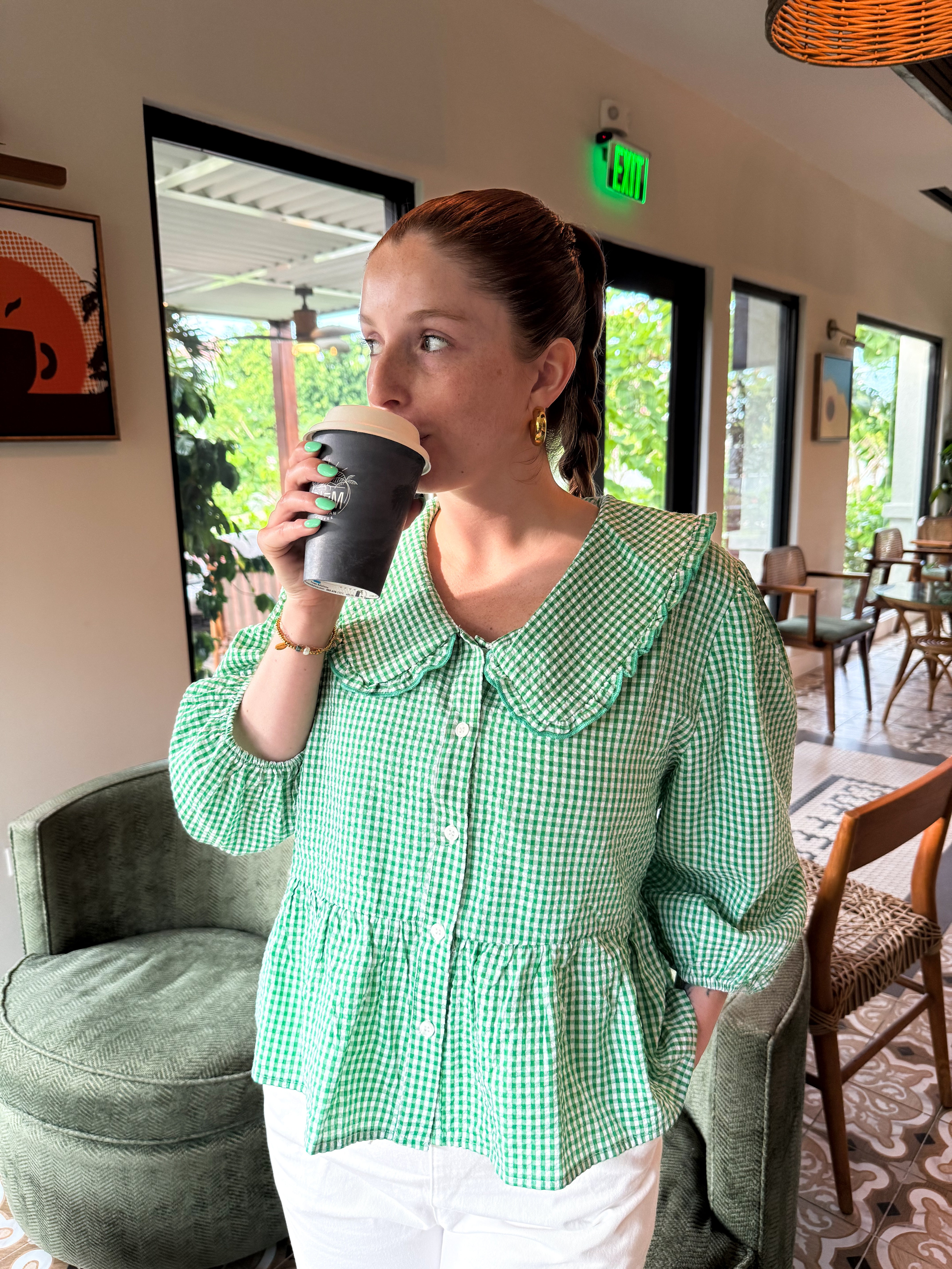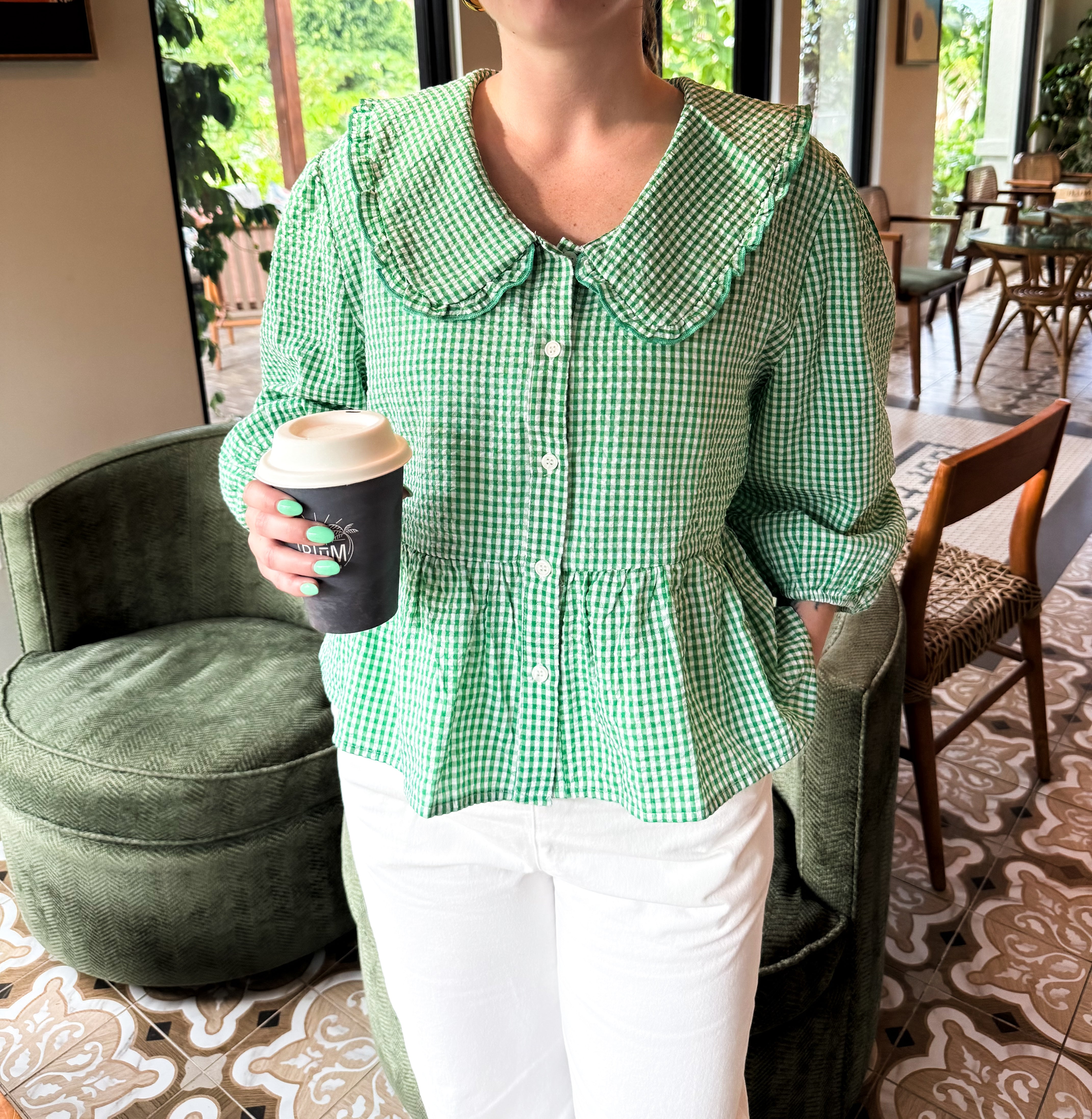 Elevate your wardrobe with timeless style in our Green & White Bib-Collar Poplin Blouse — a vintage-inspired women’s top that combines preppy elegance with everyday comfort. Designed in a crisp green and white plaid pattern, this button-up blouse features a charming Peter Pan collar and bib-style detailing that adds a playful yet polished touch to your outfit.