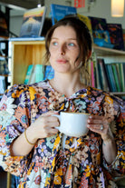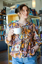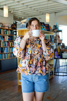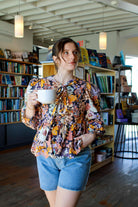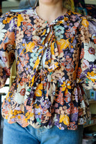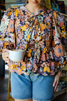 Introducing the Midnight Blossom Scallop Tie Top – add a touch of drama to your wardrobe with this stunning blouse. Featuring a moody floral print, this piece is both eye-catching and stylish. The bow tie front offers a playful detail, while the babydoll silhouette creates a flattering fit. With mid puff sleeves, elastic cuffs, pleated shoulders, and a clean scallop hem, this blouse blends vintage-inspired charm with modern flair. The round neckline with tie straps on the placket adds the perfect finishing touch. This top pairs effortlessly with jeans or a skirt for a versatile and chic look. Embrace the dark beauty of the Midnight Blossom Scallop Tie Top – where sophistication meets a hint of intrigue.