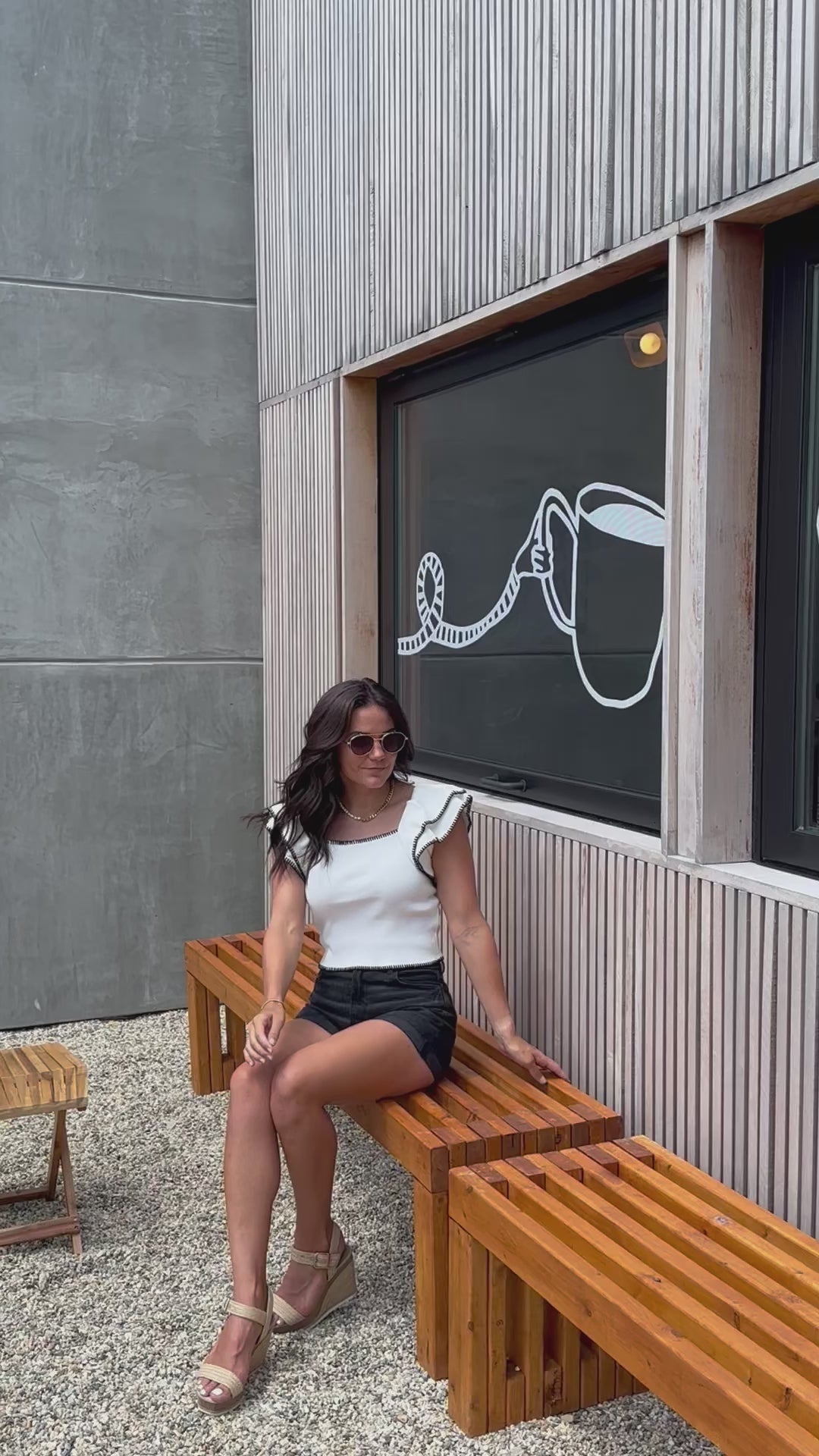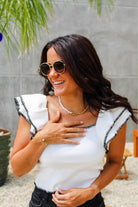 Discover sophistication redefined with our Embroidered Double Ruffled Short Sleeve Knit Top in classic white, adorned with black embroidery. This isn't your ordinary top – featuring charming double ruffled sleeves and delicate detailing, it exudes effortless elegance and timeless appeal. Crafted from soft, breathable knit fabric, it ensures comfort without compromising style. Whether paired with jeans for a chic casual look or dressed up with tailored pants, elevate your wardrobe with this versatile piece that stands out from the crowd.