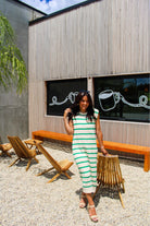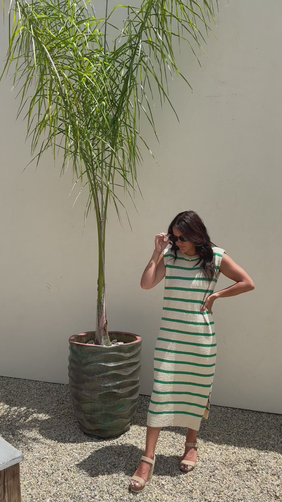 Elevate your summer wardrobe with our sleeveless Emerald Striped Knit Midi Dress, a versatile staple that seamlessly transitions from day to night. Crafted from luxurious knit fabric adorned with chic emerald stripes, this dress combines comfort with timeless elegance. Enhanced by subtle shoulder pads for a structured silhouette and featuring a sleek slit on the left side, it offers modest coverage with a hint of allure. Perfect for any occasion, this dress pairs effortlessly with heels for an evening look or with sneakers for a laid-back day out.