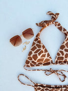 Introducing this animal print bikini top can be worn many ways with its adjustable ties. It features buttery soft fabric with removable padded cups and a giraffe print.