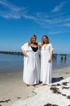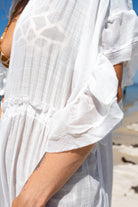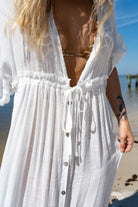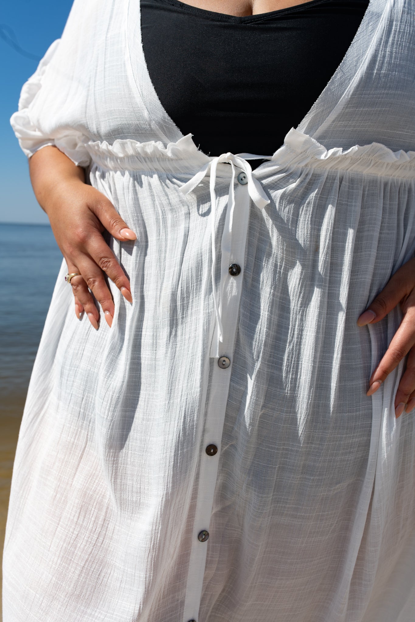 Introducing the white light and breezy cover-up featuring adjustable waist ties, button closure, working pockets, light material, and small ruffle design