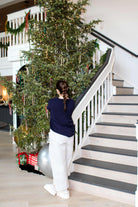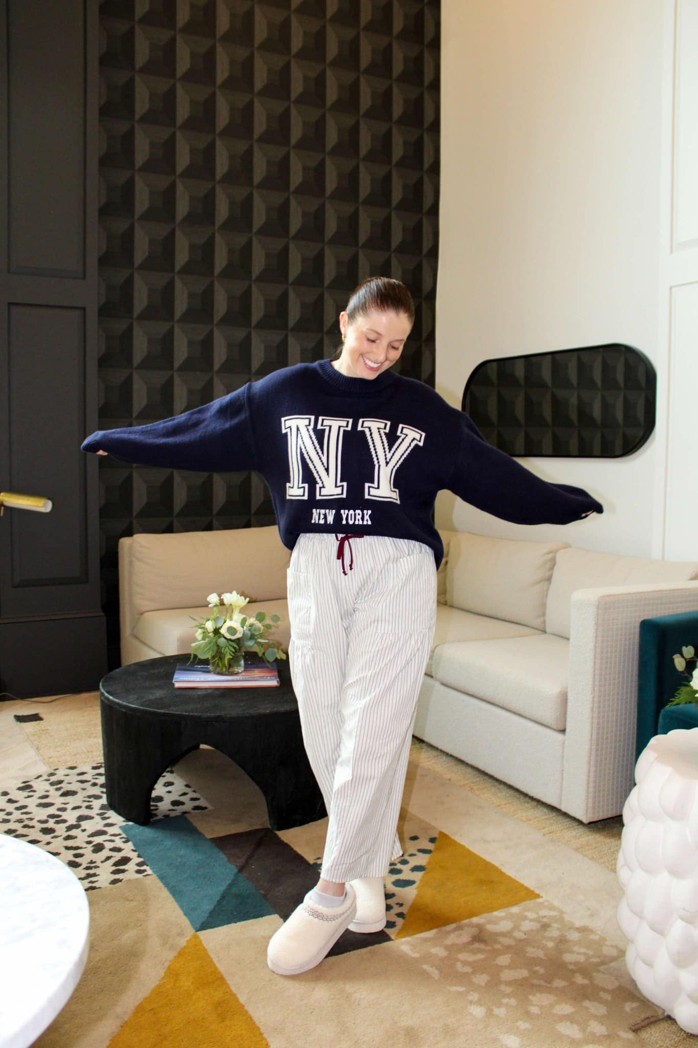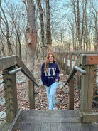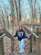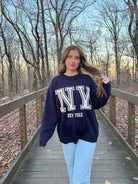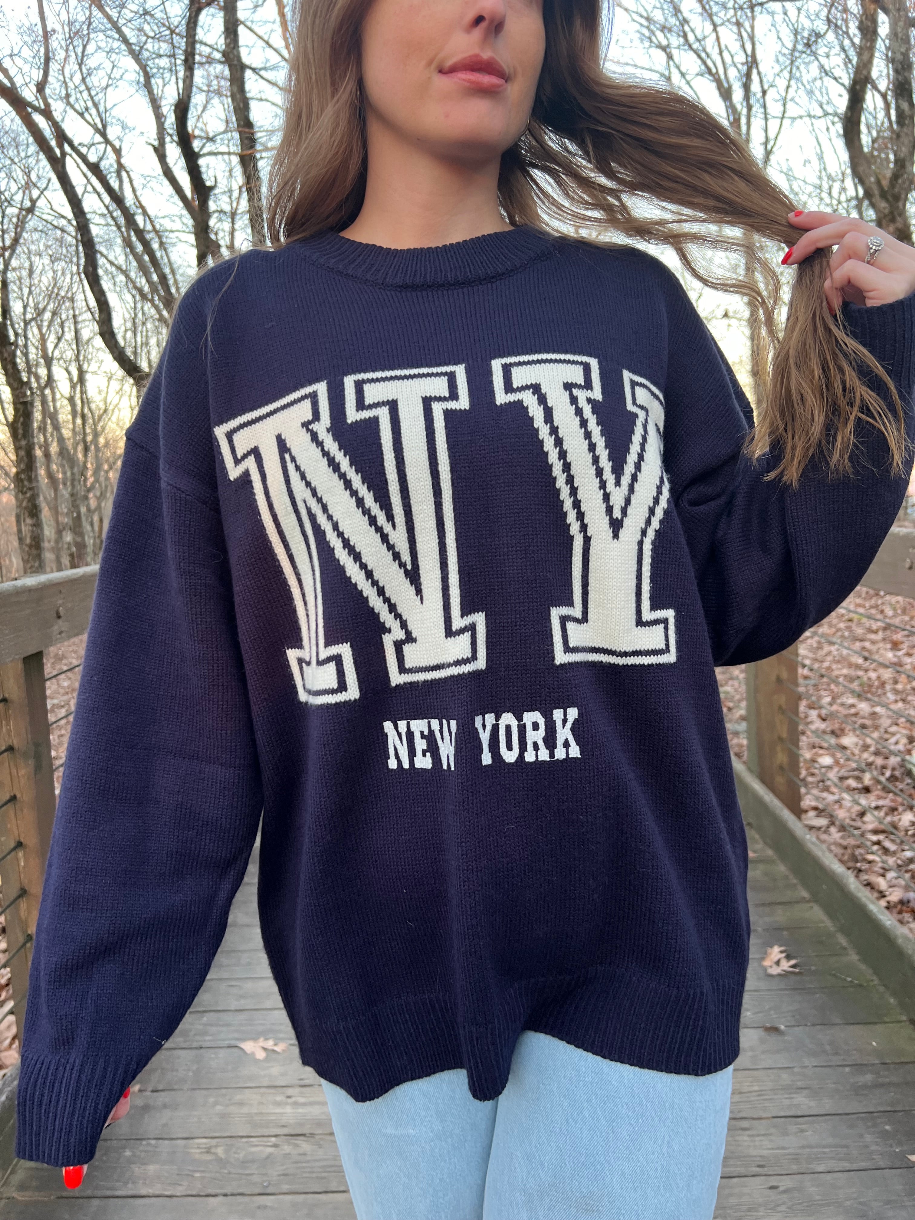 Stay warm and stylish with the New York Oversized Sweater! This navy and white lightweight loose-fitting top is perfect for layering or wearing on its own for any season. Always on trend, this versatile piece can pair with anything if you style it right, making it a must-have for your wardrobe.