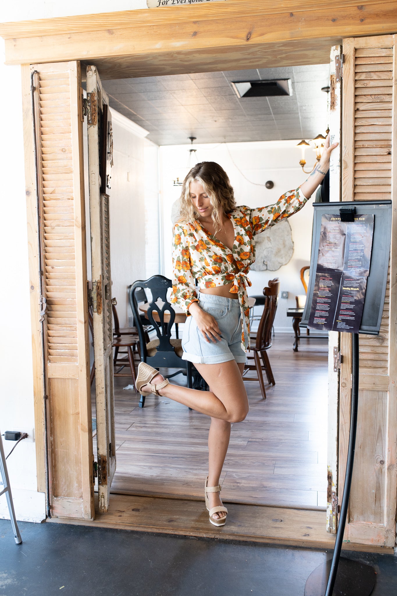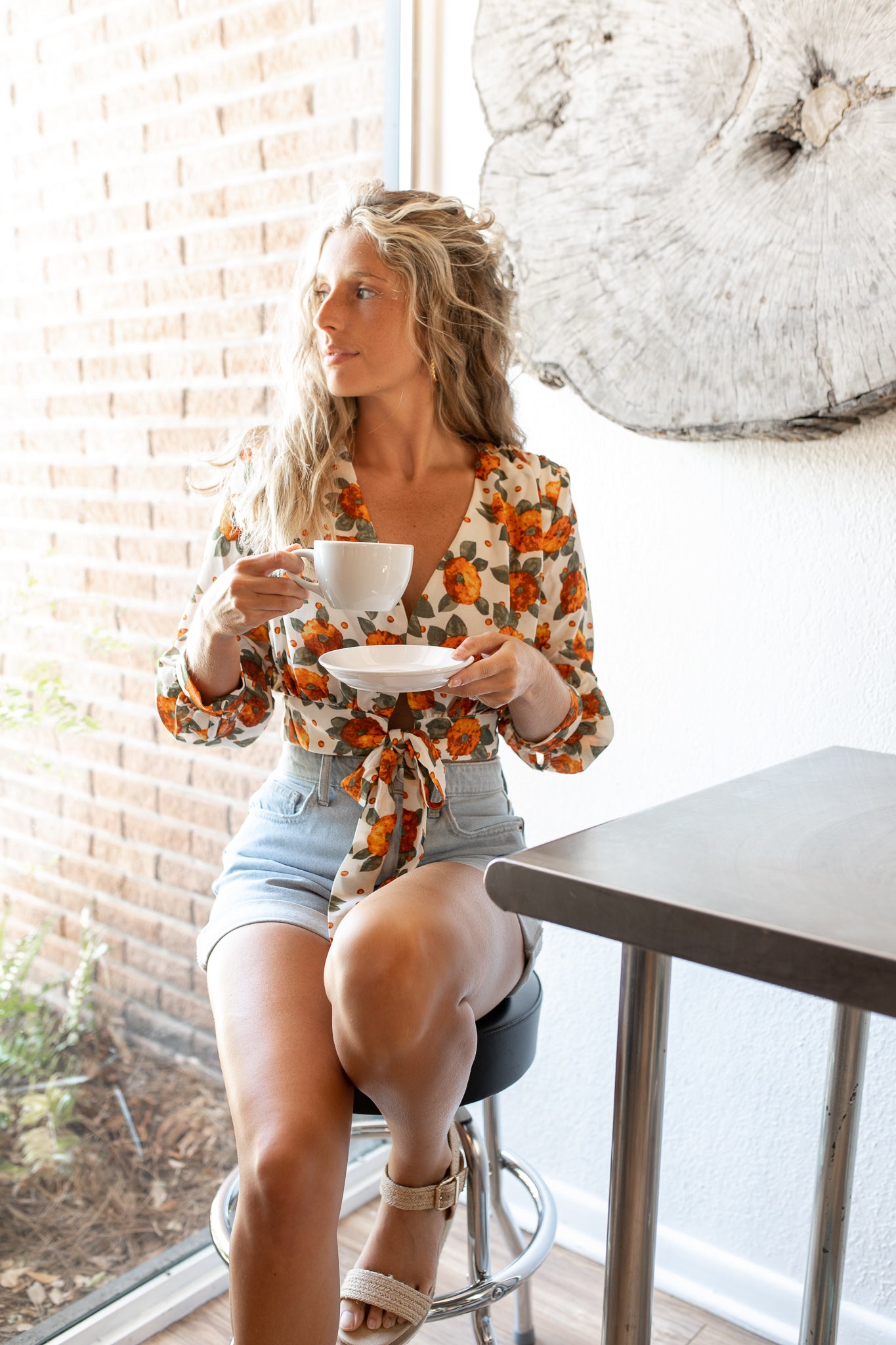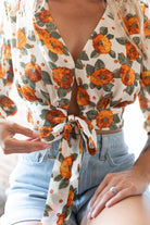 Featuring padded shoulders, v neckline, front hidden simple snap with a self tie right at the waistline, and a thin inner lining.