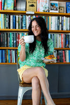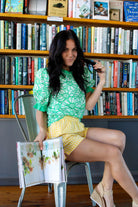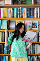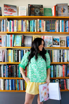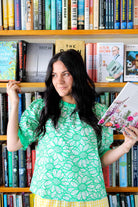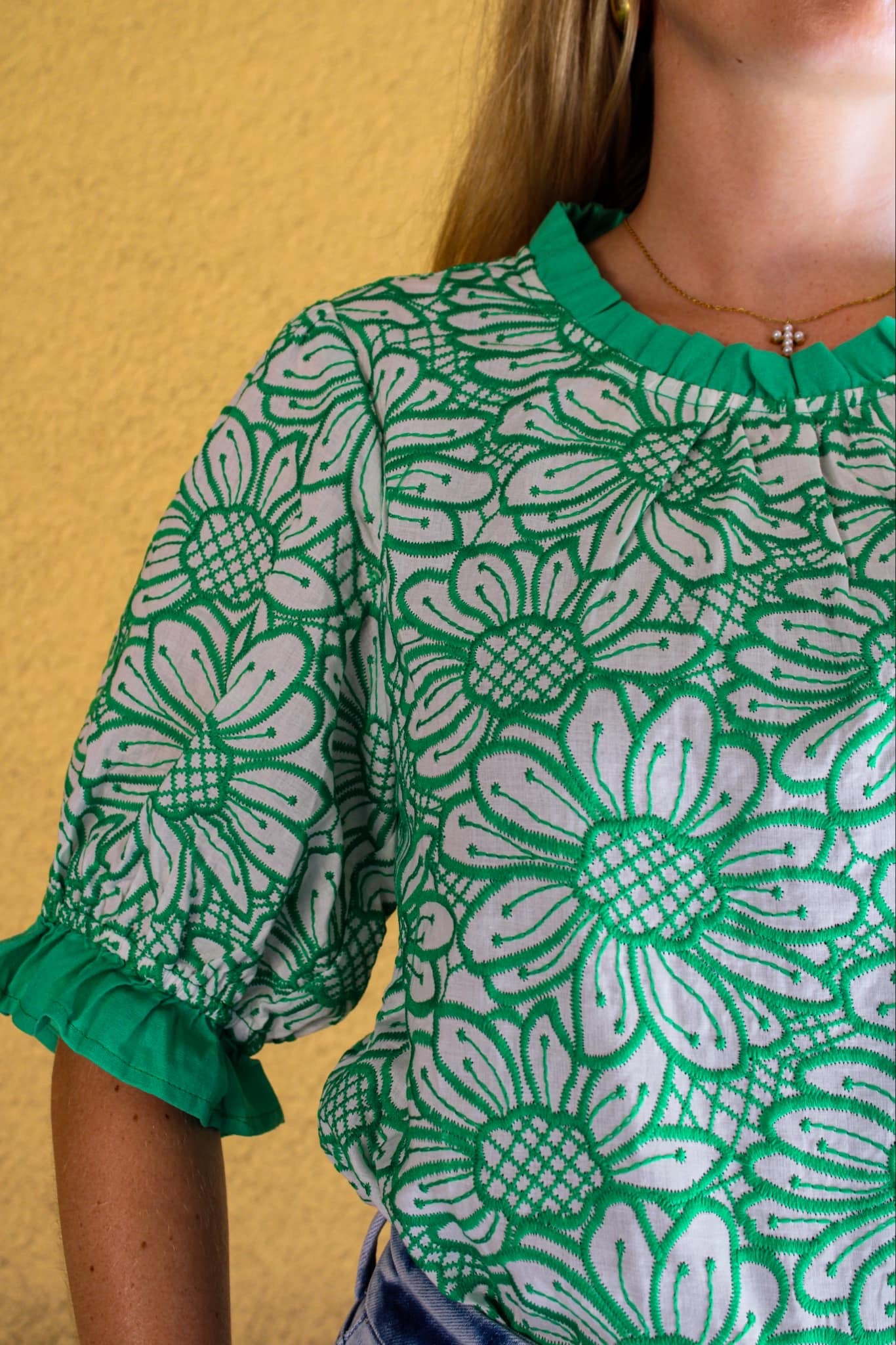 Introducing the "Ruffle Bloom Blouse." Featuring a chic round neck with a contrast band, puff short sleeves with matching accents, and a delicate back button and elastic loop closure, this green beauty combines playful ruffles with sophisticated floral embroidery for a look that's both fresh and timeless.