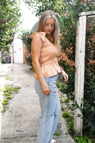 This top features a square neck, smocked ruffle, trim top, and adjustable straps.