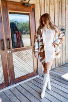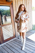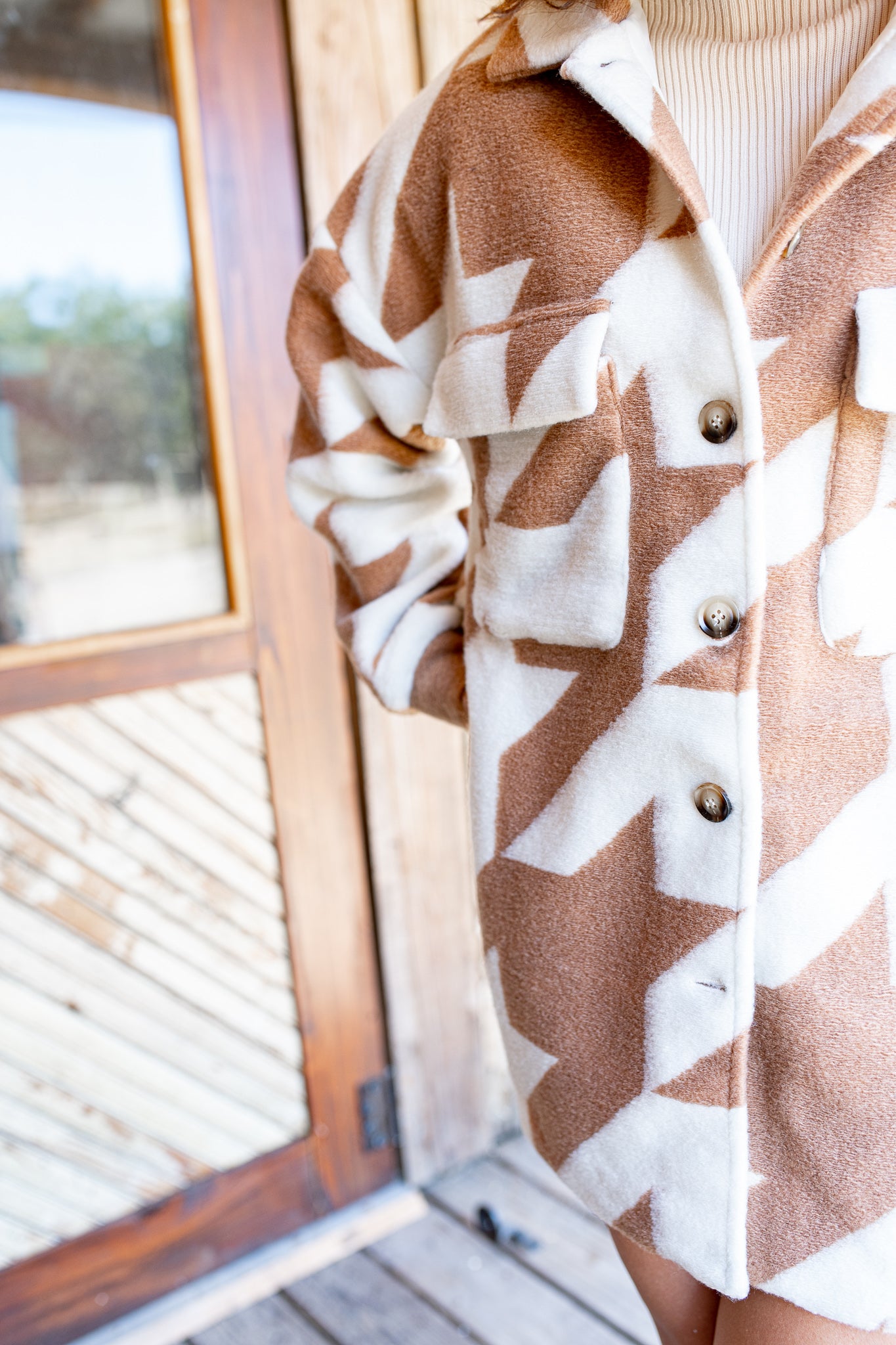 Better late than never. This jacket features a houndstooth pattern, an inner lining, six button front closure, working collar, two working pockets, and long sleeve with button cuffs.