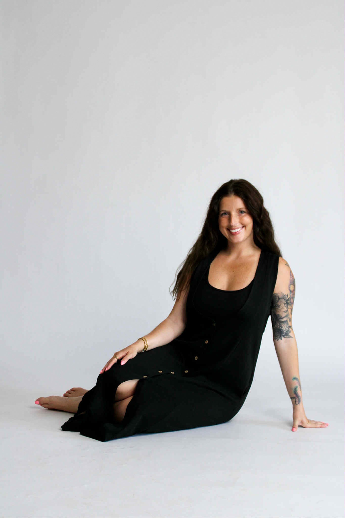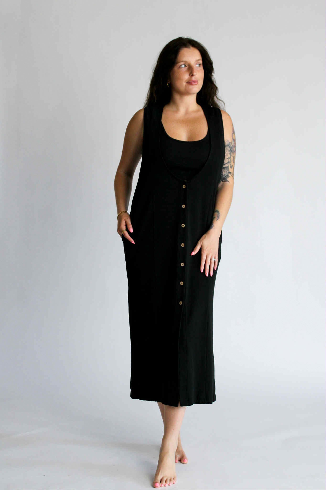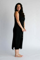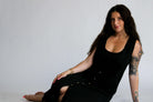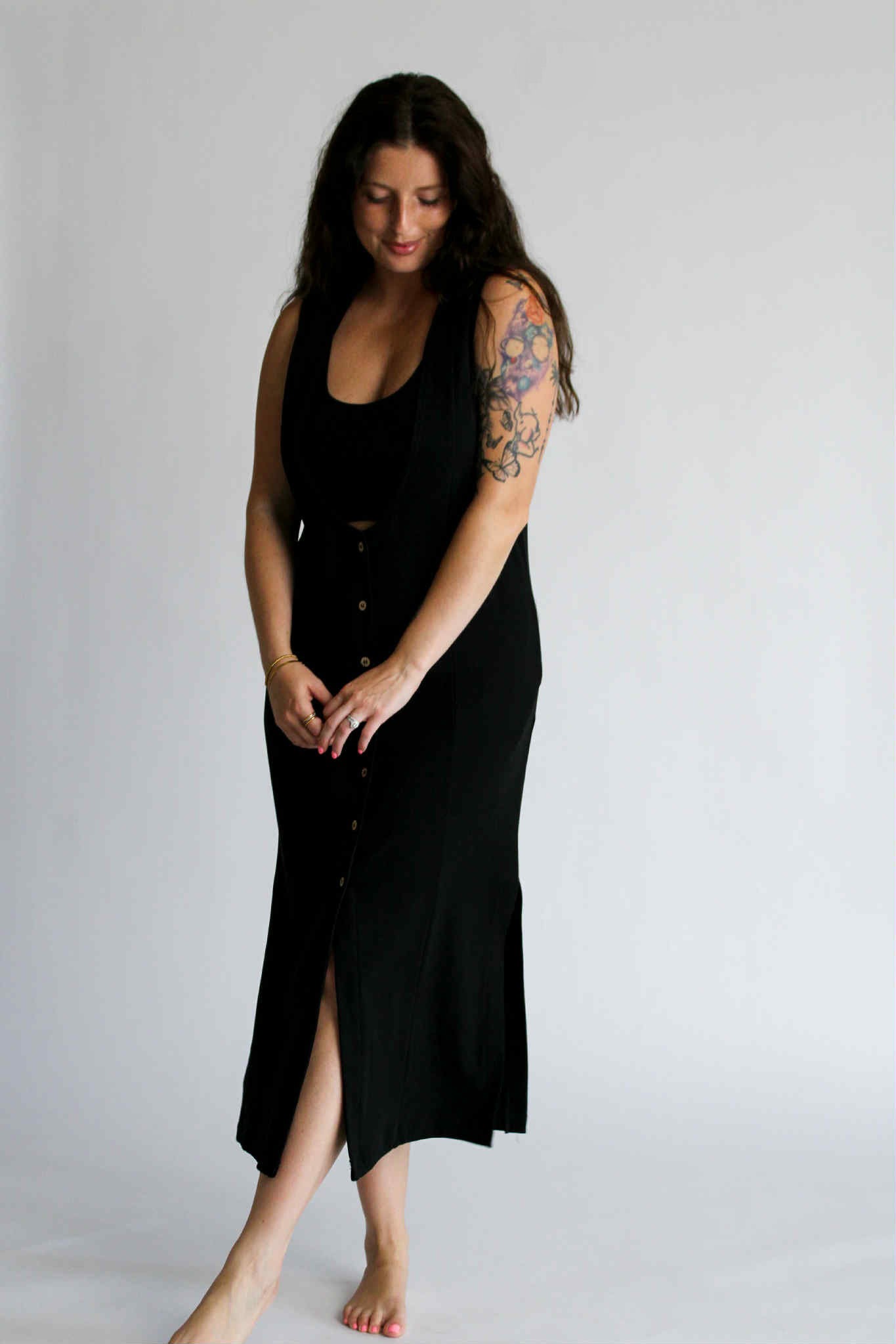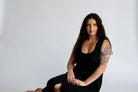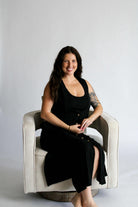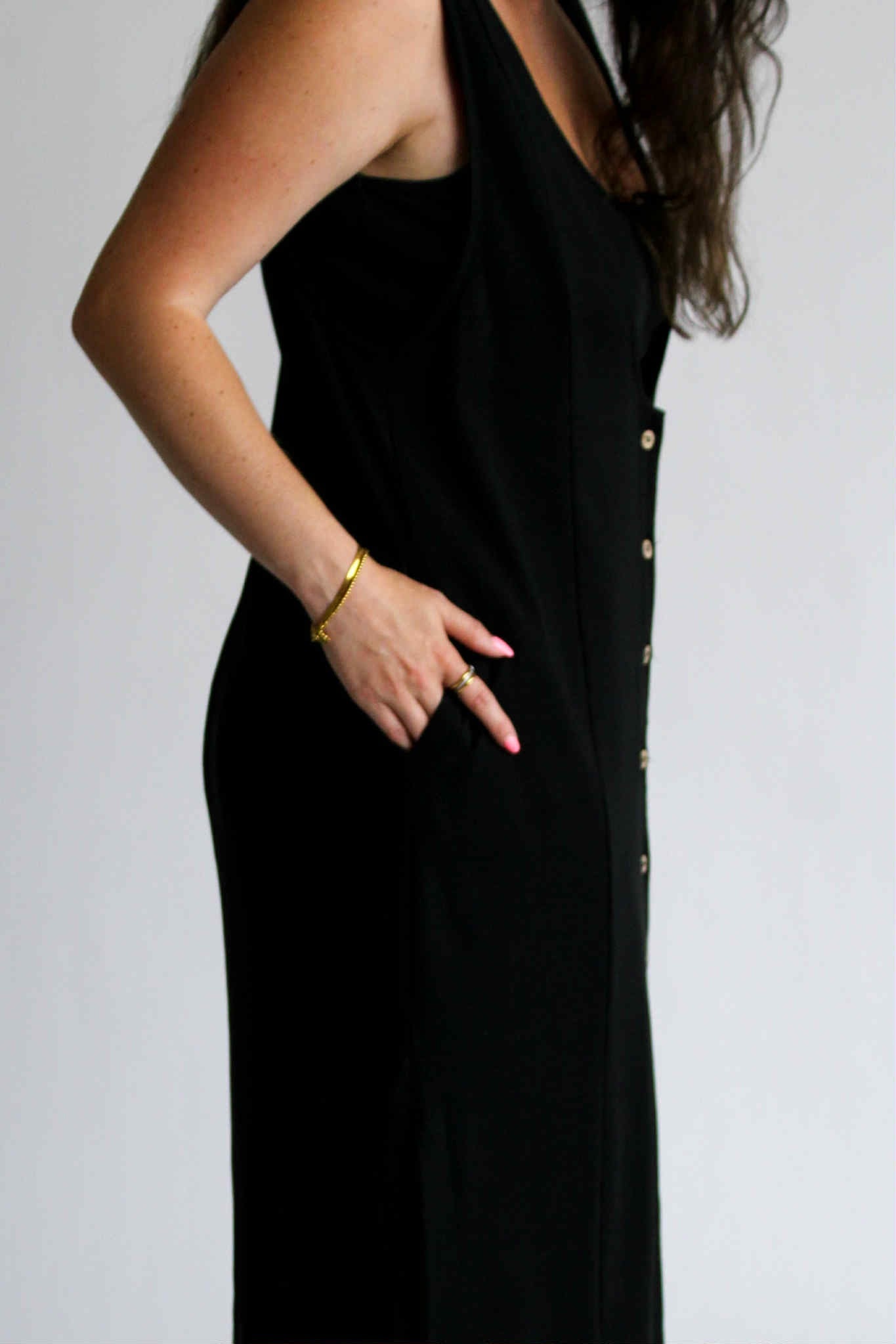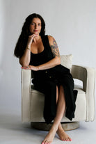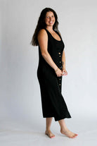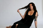 The Aesthetic Affair Black Midi Set is where minimalism meets a touch of bold. This two-piece look includes a sleek adjustable strap crop top and a deep V-neck maxi dress with side pockets and mid-length button detailing. The buttons stop intentionally short, adding a flirty edge while keeping the design polished. Ideal for evenings when you want to stand out—without overdoing it.