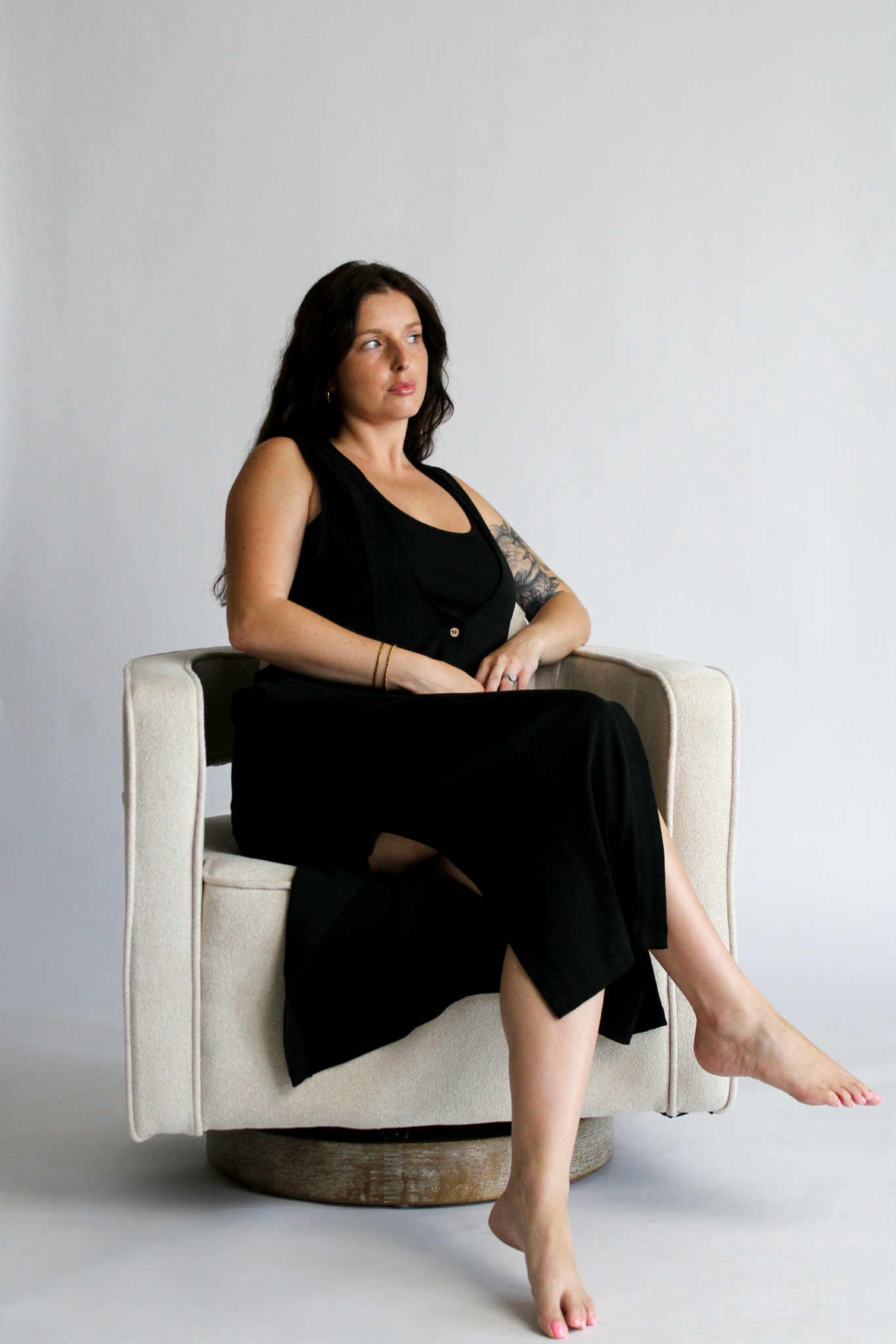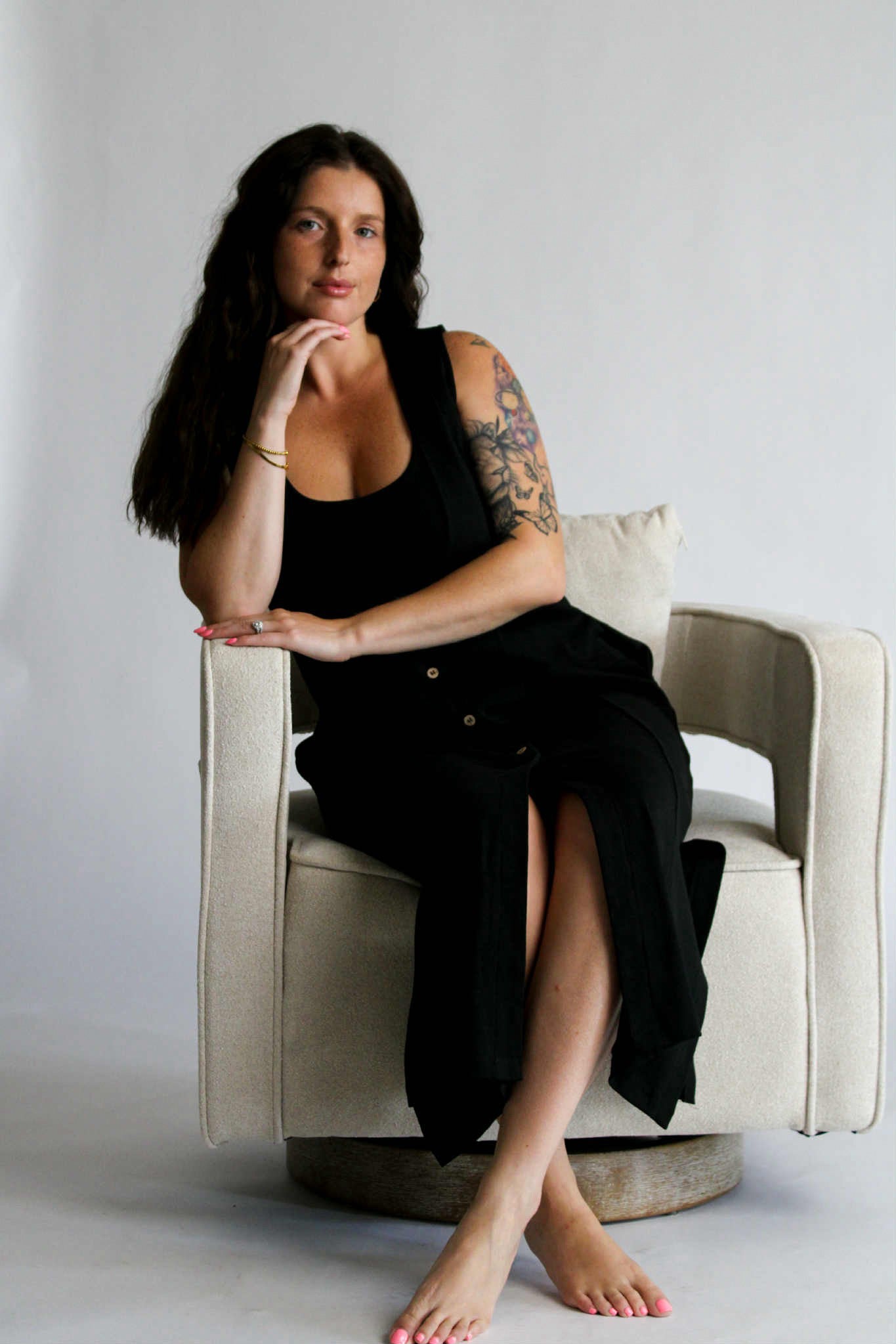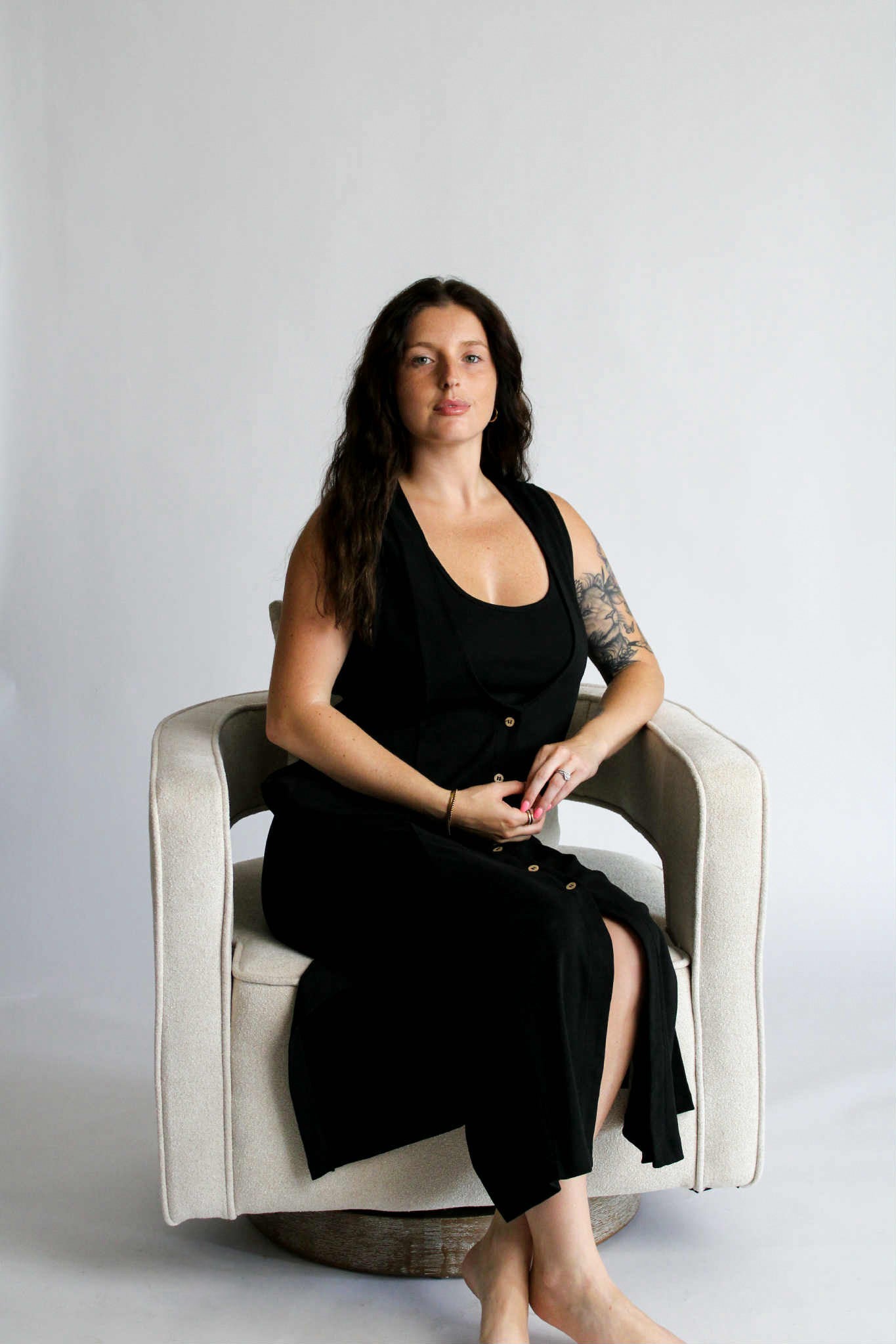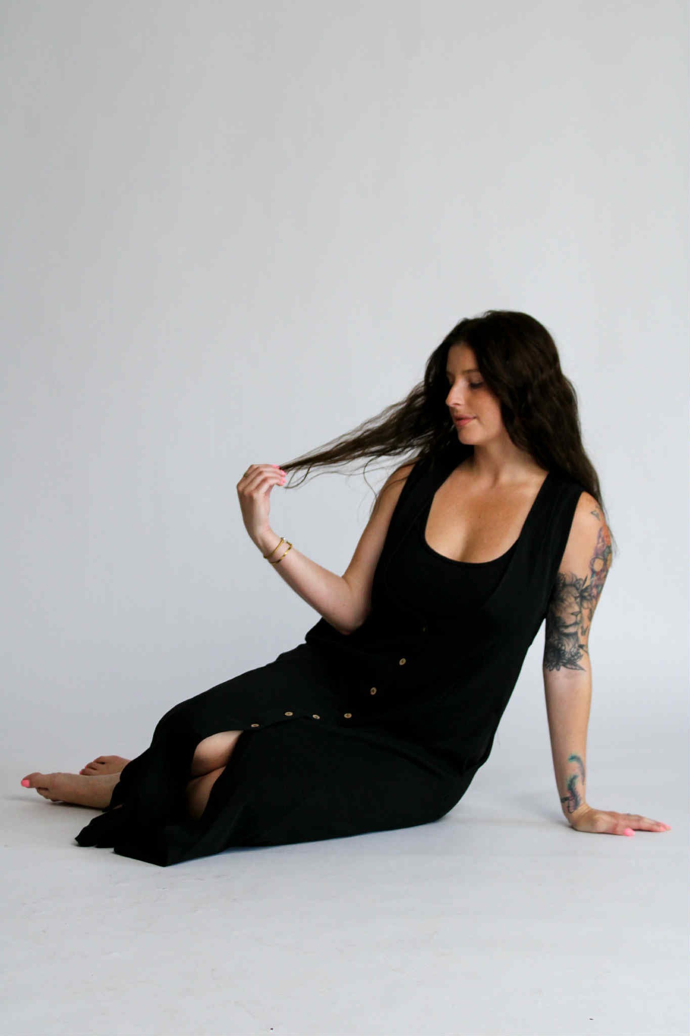 The Aesthetic Affair Black Midi Set is where minimalism meets a touch of bold. This two-piece look includes a sleek adjustable strap crop top and a deep V-neck maxi dress with side pockets and mid-length button detailing. The buttons stop intentionally short, adding a flirty edge while keeping the design polished. Ideal for evenings when you want to stand out—without overdoing it.