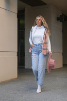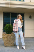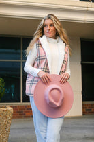 Introducing a pink plaid vest featuring a collard neckline, fleece lined inside, flat metal alloy snap buttons, and metal zipper.