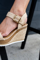 Introducing the beachy jute wedge featuring an open toe, adjustable gold ankle strap, and wedge platform